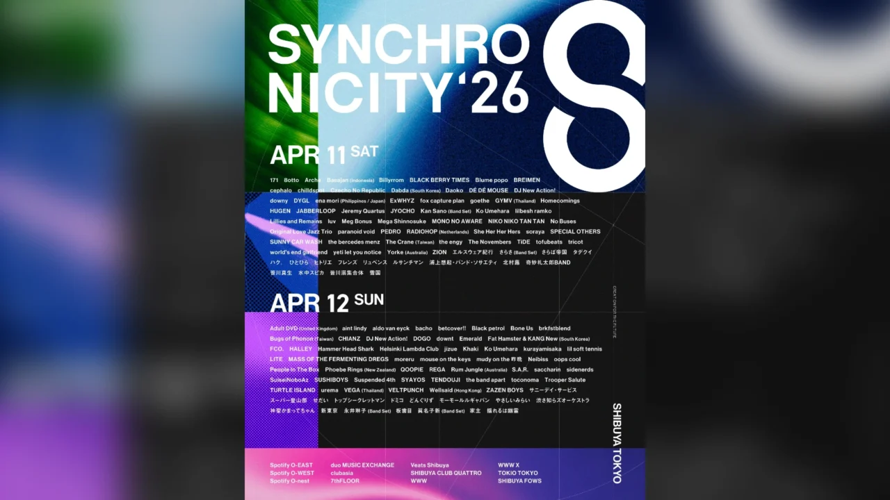『SYNCHRONICITY』は、「CREATION FOR THE FUTURE」をテーマに掲げる都市型ミュージック&カルチャーフェスティバル。20周年を迎える2025年は、過去最大規模となる11ヶ所のライブハウスで開催される。これまでに、踊ってばかりの国、Khaki、HALLEY、浪漫革命、東京スカパラダイスオーケストラ、ZAZEN BOYS、TENDRE、どんぐりず、北村蕗、NOT WONK、Helsinki Lambda Clubなど80組の出演が発表されていた。