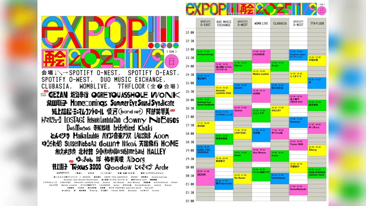 2007年にスタートし、特別編も含めると180回以上の開催を入場無料で続けてきた『exPoP!!!!!』の新企画となる『exPoP!!!!!再会 2025』。東京・渋谷のSpotify O-nest、Spotify O-EAST、Spotify O-west、duo MUSIC EXCHANGE、clubasia、WOMB LIVE、7th FLOORの7会場を使ったサーキットフェスとなる。これまでに、WONK、柴田聡子、Homecomings、寺尾紗穂、パソコン音楽クラブ、Helsinki Lambda Club、トクマルシューゴ、ゆっきゅんら23組の出演が発表されていた。