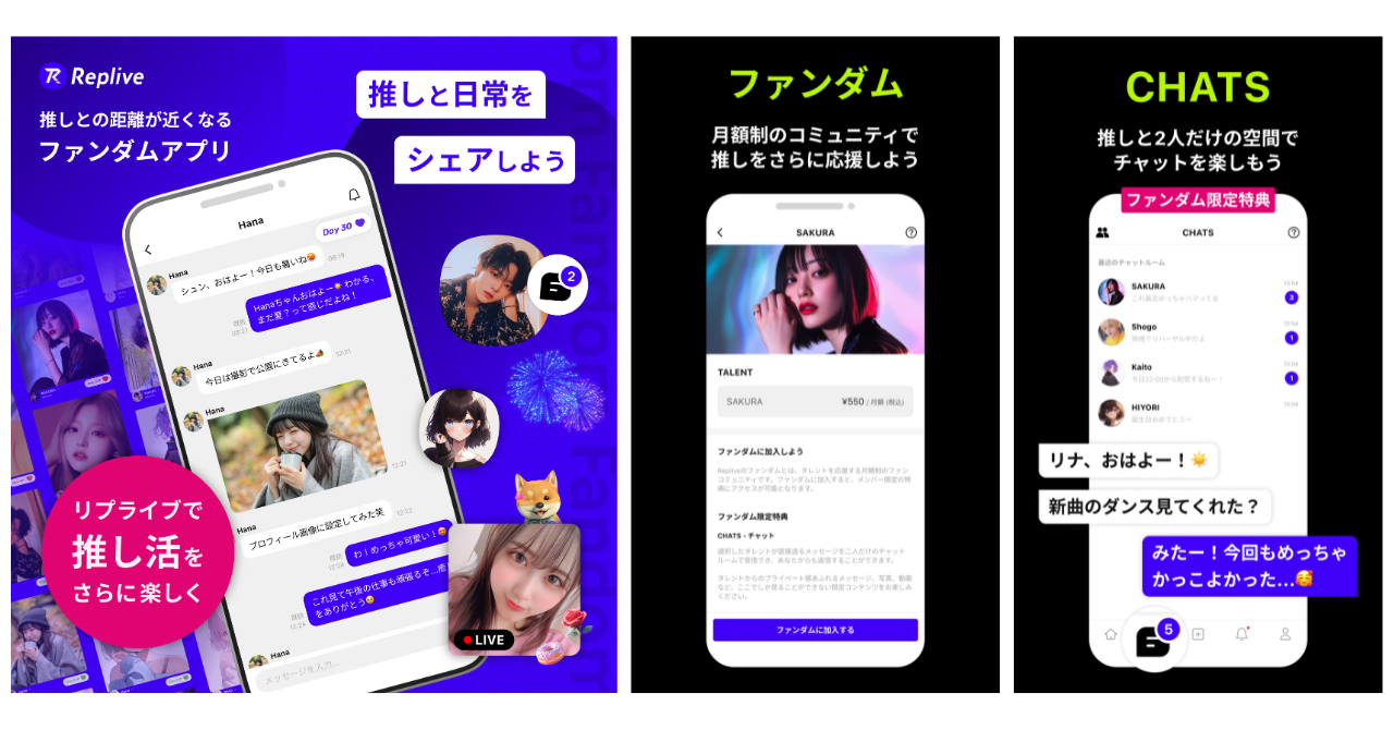 同アプリ内の有料会員限定ファンコミュニティ機能・ファンダムでは、推しと2人だけのプライベート空間でチャットできるチャット機能や、推しのQ&Aをライブ配信やショート動画でいつでも楽しむことができ、質問や応援メッセージを送ると、ユーザーに向けた推しからのメッセージ動画を視聴することができるリプライ機能が展開される。