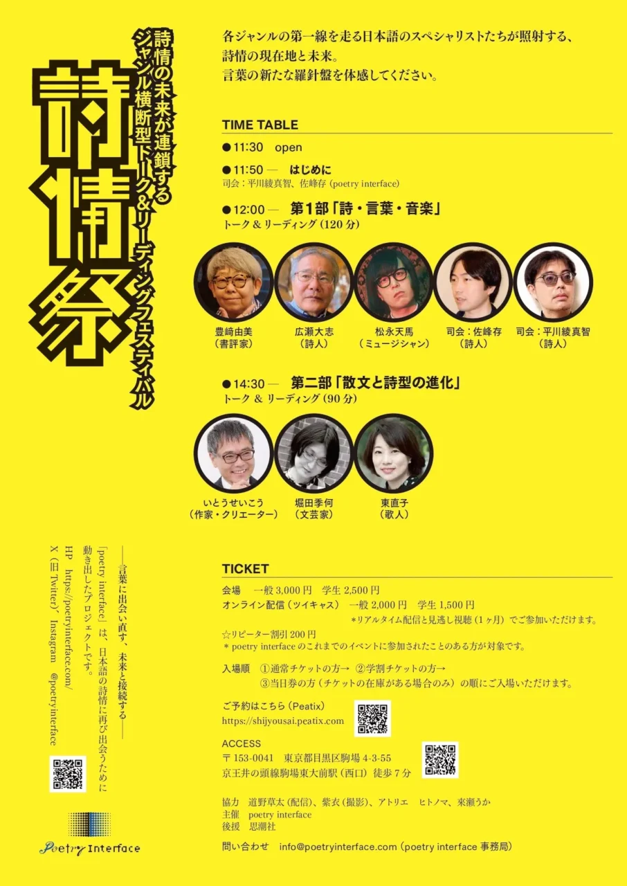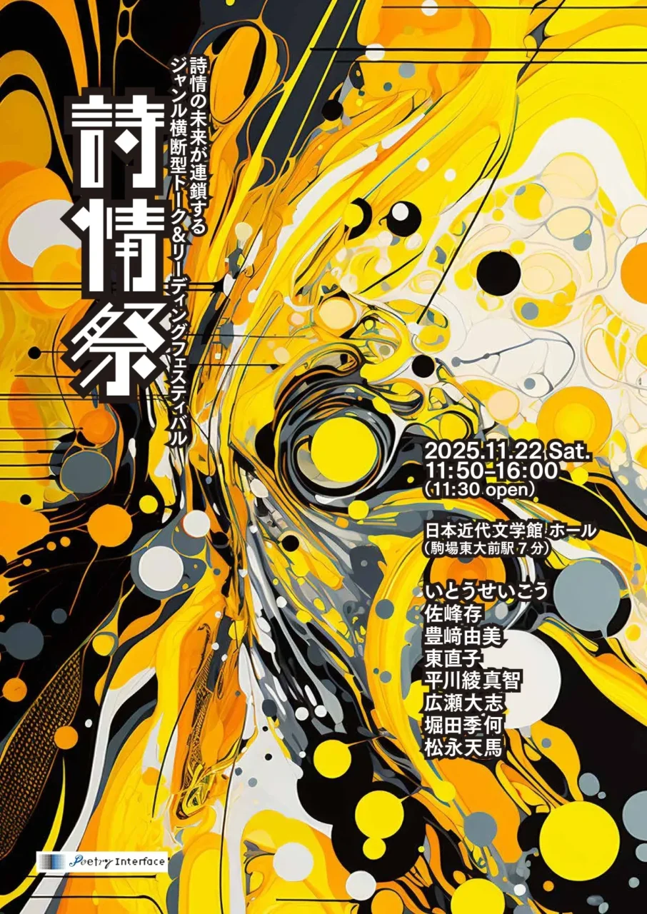 これまでジャンルや国境を越えた文学イベントを開催してきた「poetry interface」が主催する、同イベント。詩人や書評家、ミュージシャンなど、各ジャンルのアーティストたちによる「詩情」を軸とした対談や朗読が行われる。