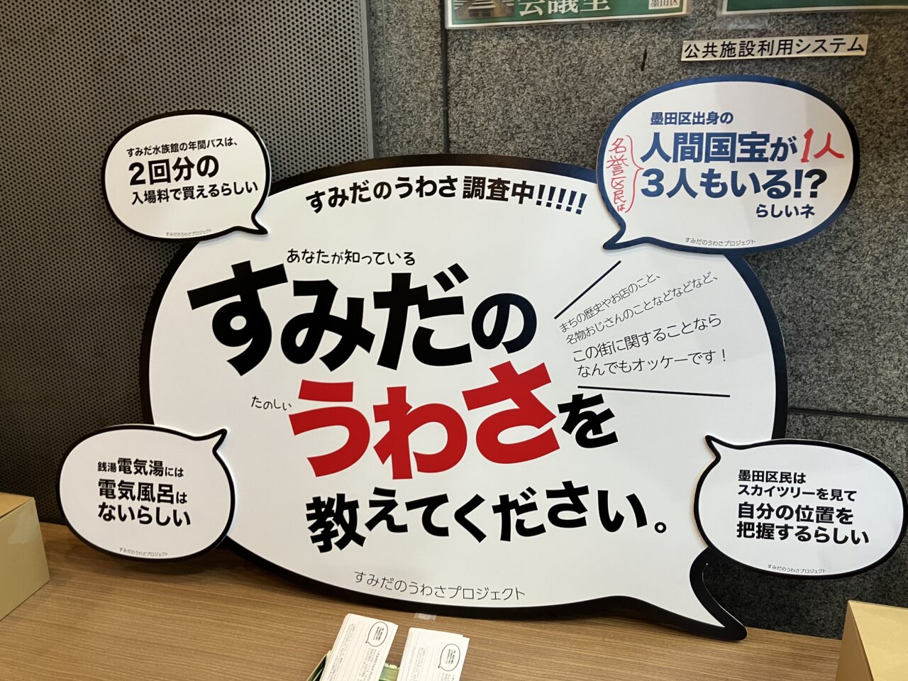 すみだの歴史や街にあるうわさをリサーチし、「うわさ」風の文体にまとめ、フキダシ型のシールにして街に貼っていくアートプロジェクトです。当日は、隅田公園内のお店に関する「うわさ」や墨田区内の「うわさ」を設置しています。