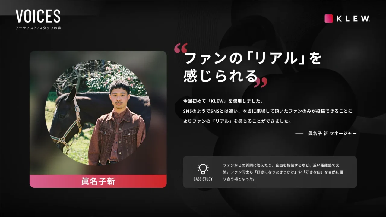 KLEWは、同一公演のライブチケットを保有するファン同士やファンと出演するアーティストだけがデジタル上でコミュニケーションを取れる国内初のプラットフォームとして2024年11月にリリース。
