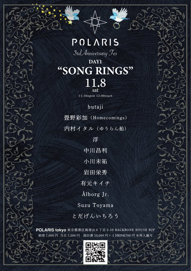 11月8日(土)、9日(日)にはPOLARISの3周年イベント『POLARIS 3rd ANNIVERSARY FES』が開催される。butaji、Homecomings・畳野彩加、ゆうらん船・内村イタル、浮らが登場する1日目は「SONG RINGS」と題され歌に重きをおいたラインナップに。2日目は「DEPARTURE」をテーマに勝井祐二、ナスノミツル、福原音、細野悠太らPOLARIS馴染みのメンバーが出演する。