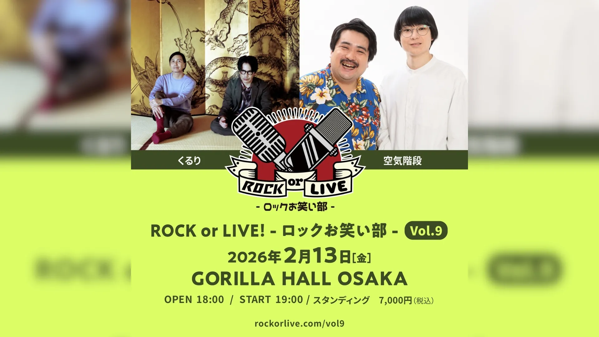 『ROCK or LIVE!-ロックお笑い部-Vol.9』が2026年2月13日(金)、 大阪・GORILLA HALL OSAKAにて開催される。