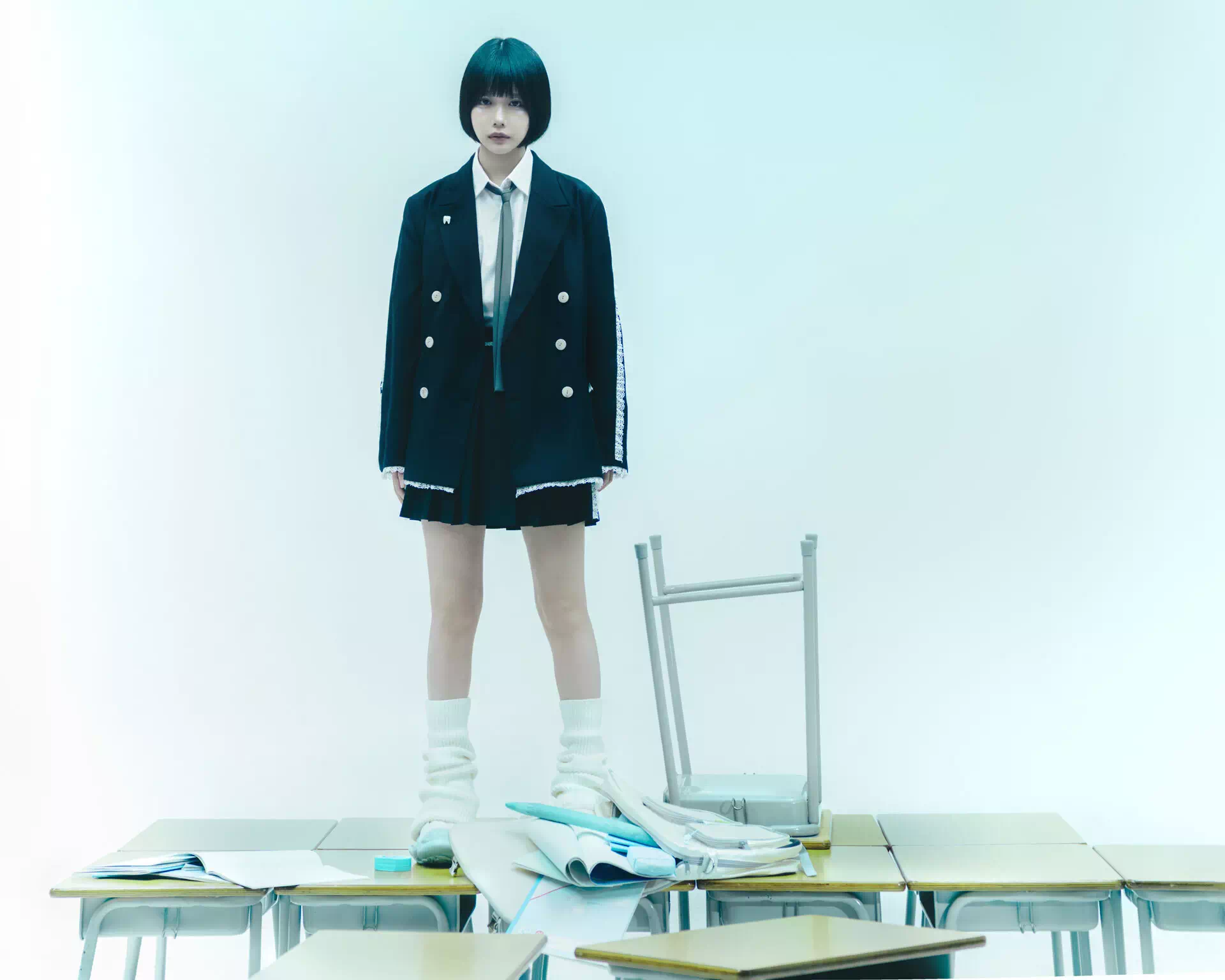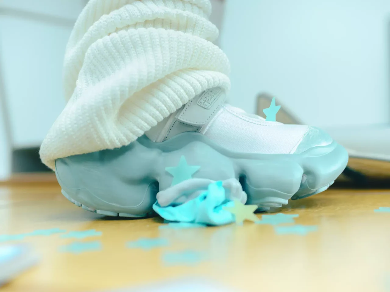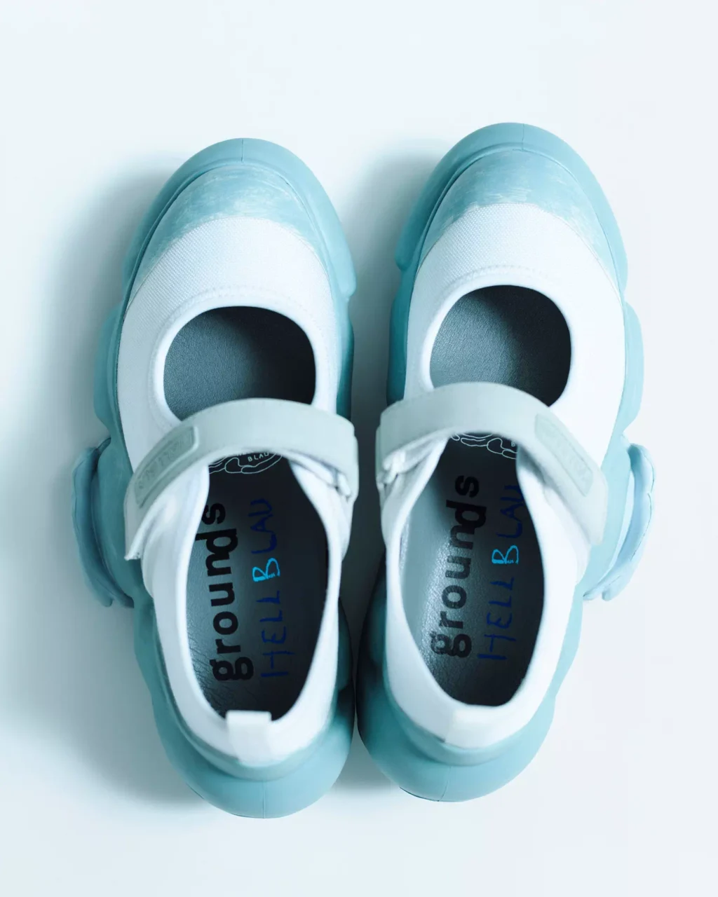 HELL BLAUの今季コンセプトである「school」から着想し、「上履き」をモチーフにgroundsの人気モデル・MOOPIEとコラボレーションした同作。ソールにはHELL BLAU象徴の水色を使い、あのが好むブルー×グレーを調色して使用したカラーが用いられている。さらに、デザインは手塗り風で、アウトソール部分にはガムを踏んだような遊び心のワンポイントが加えられており、「上履き感」がありつつも日常使いができるファッションアイテムとして仕上げられている。