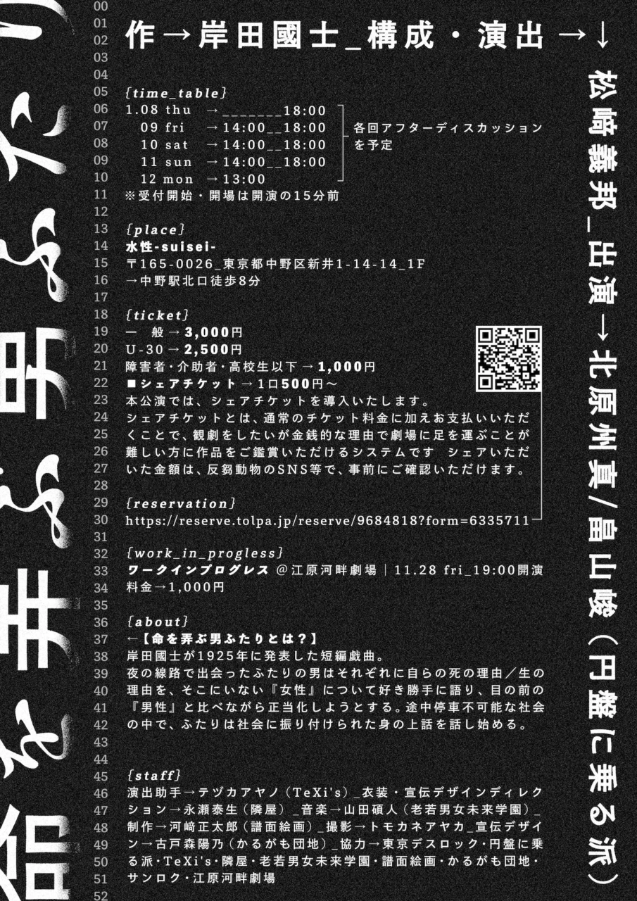構成 / 演出は松﨑義邦が務め、出演者には北原州真と畠山駿(円盤に乗る派)が名を連ねている。アフターディスカッションには、小野晃太朗(劇作家 / ドラマトゥルク)、清田隆之(「桃山商事」代表)、大前粟生(小説家)がゲスト出演する。
