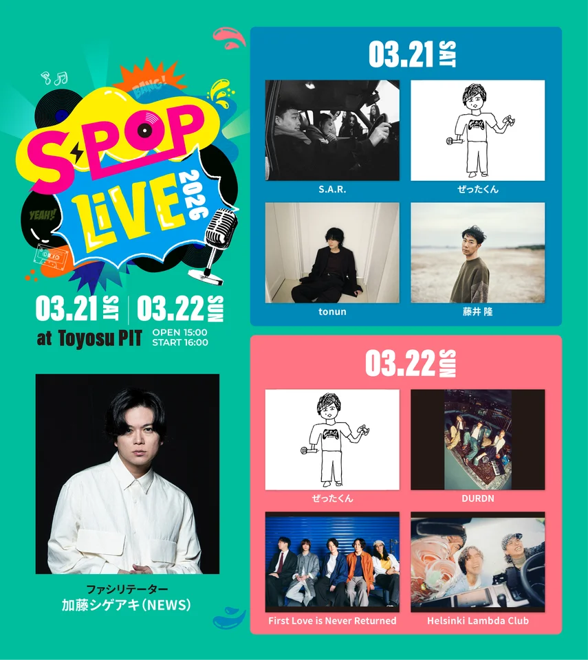 NEWSの加藤シゲアキがファシリテーターを務める音楽イベント『S-POP LIVE』が、2026年3月21日(土)と22日(日)に東京・豊洲PITで開催される。