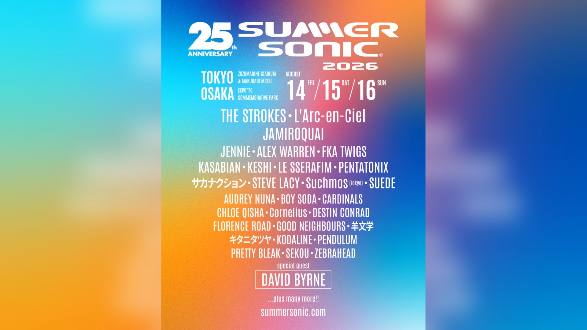 今回、同イベントのヘッドライナーとして、THE STROKESとL’Arc-en-Cielが出演することが発表された。あわせて、JAMIROQUAI、JENNIE、ALEX WARREN、FKA TWIGS、KASABIAN、KESHI、LE SSERAFIM、PENTATONIX、サカナクション、STEVE LACY、Suchmos(Tokyo) 、SUEDE、AUDREY NUNA、BOY SODA、CARDINALS、CHLOE QISHA、Cornelius、DESTIN CONRAD、FLORENCE ROAD、GOOD NEIGHBOURS、羊文学、キタニタツヤ、KODALINE、PENDULUM、PRETTY BLEAK、SEKOU、ZEBRAHEADら、国内外の最重要アーティスト29組がラインナップ。さらに、DAVID BYRNEがスペシャルゲストとして出演することも明かされた。