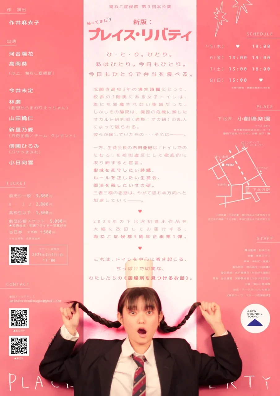 同作は、海ねこ症候群5周年企画の第1弾として、2023年の下北沢初進出作品を大幅に改訂したもの。高校の女子トイレを舞台に、聖域を死守したい女子生徒、ルールを正したい生徒会、部活を残したいオカルト研究部、それぞれの思惑が思わぬ方向へと加速していく、「私たちの“居場所を見つけるお話”」となっている。
