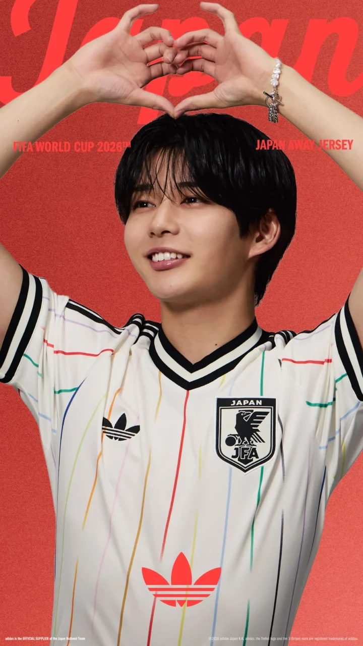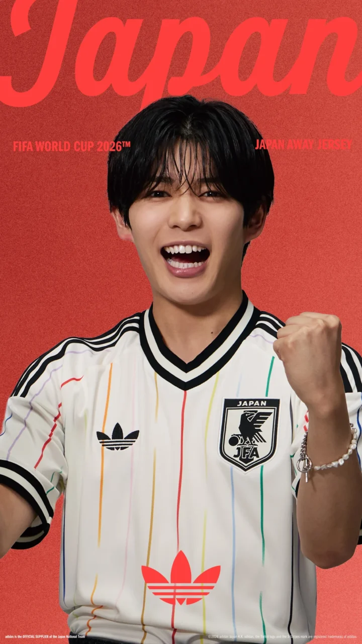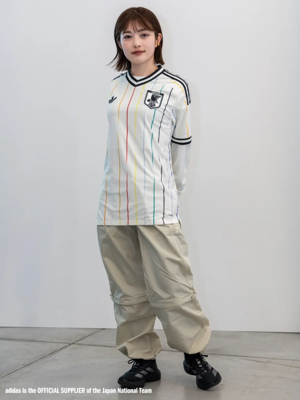 今回のアウェイ ユニフォームは、白のユニフォームにカラフルなラインがあり、そこにトレフォイルロゴがあるデ ザインがすごく新鮮で、初めて見たときに「かわいい!」と思いました。 サッカーのユニフォームって、着ると自然と気持ちが上がる特別なアイテムだと思います。スタジアムで応援する ときはもちろん、日常のファッションとしても楽しめるデザインなので、是非いろんなスタイルで着て楽しんでほし いです。僕も落ち着いた色のデニムと合わせて楽しみたい!日本代表の試合でも、みんなで一緒に盛り上がりましょ う!