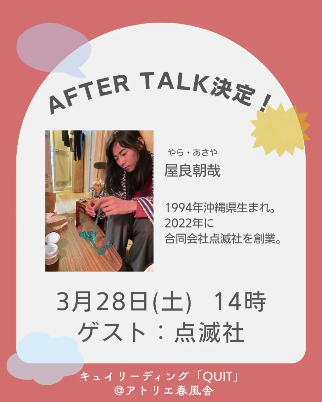 またアフタートークも予定されており、3月28日(土)14時回には点滅社の屋良朝哉、3月29日(日)14時回には反芻動物(松﨑義邦、永瀬泰生、河﨑正太郎)がゲスト出演する。