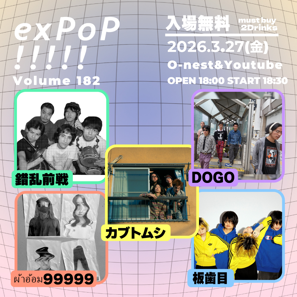『exPoP!!!!! Vol.182』のチケットは、オフィシャルサイトで予約を受付中(要2ドリンクオーダー)。YouTubeでの生配信も行われる。