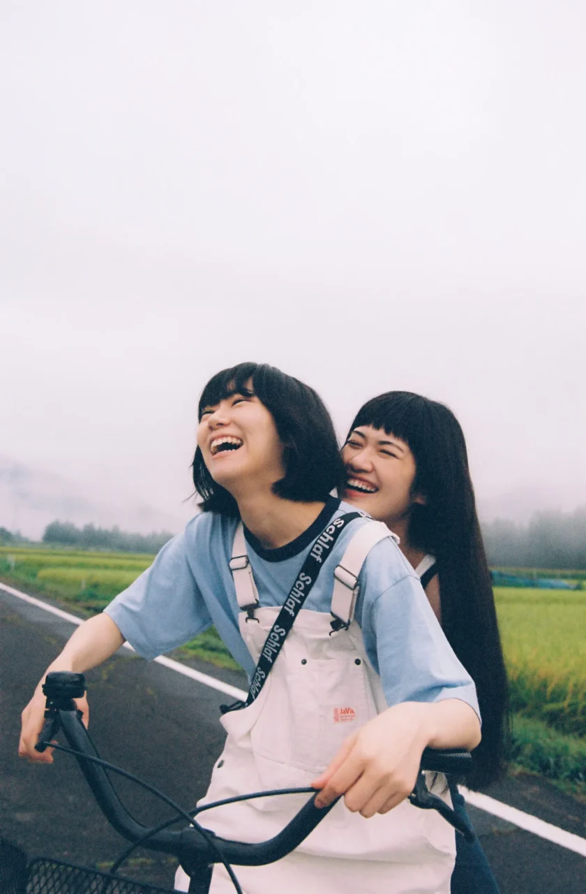 今回解禁されたのは、フィルム写真5点。満面の笑みで優実と⽯井が自転車で二人乗りする様子や、酒屋の前で佇む姿など、今はもう戻ることのできない「かけがえのない瞬間」が切り取られている。