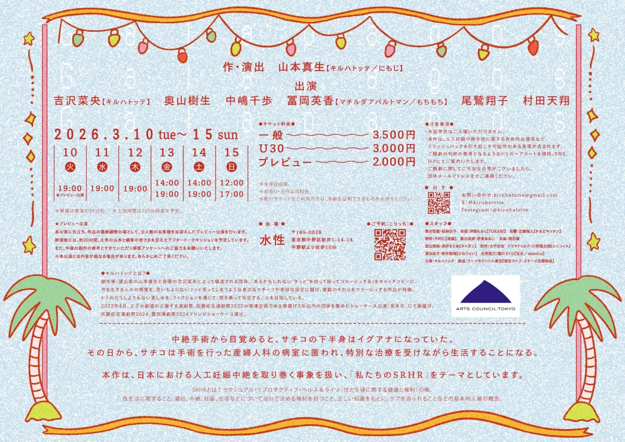 ・本作は、人工妊娠中絶手術に関する具体的な描写など、フラッシュバックを引き起こす可能性のある表現が含まれます。ご観劇の判断の参考となるようなトリガーアラートを随時、SNS、HPにてご案内いたします。