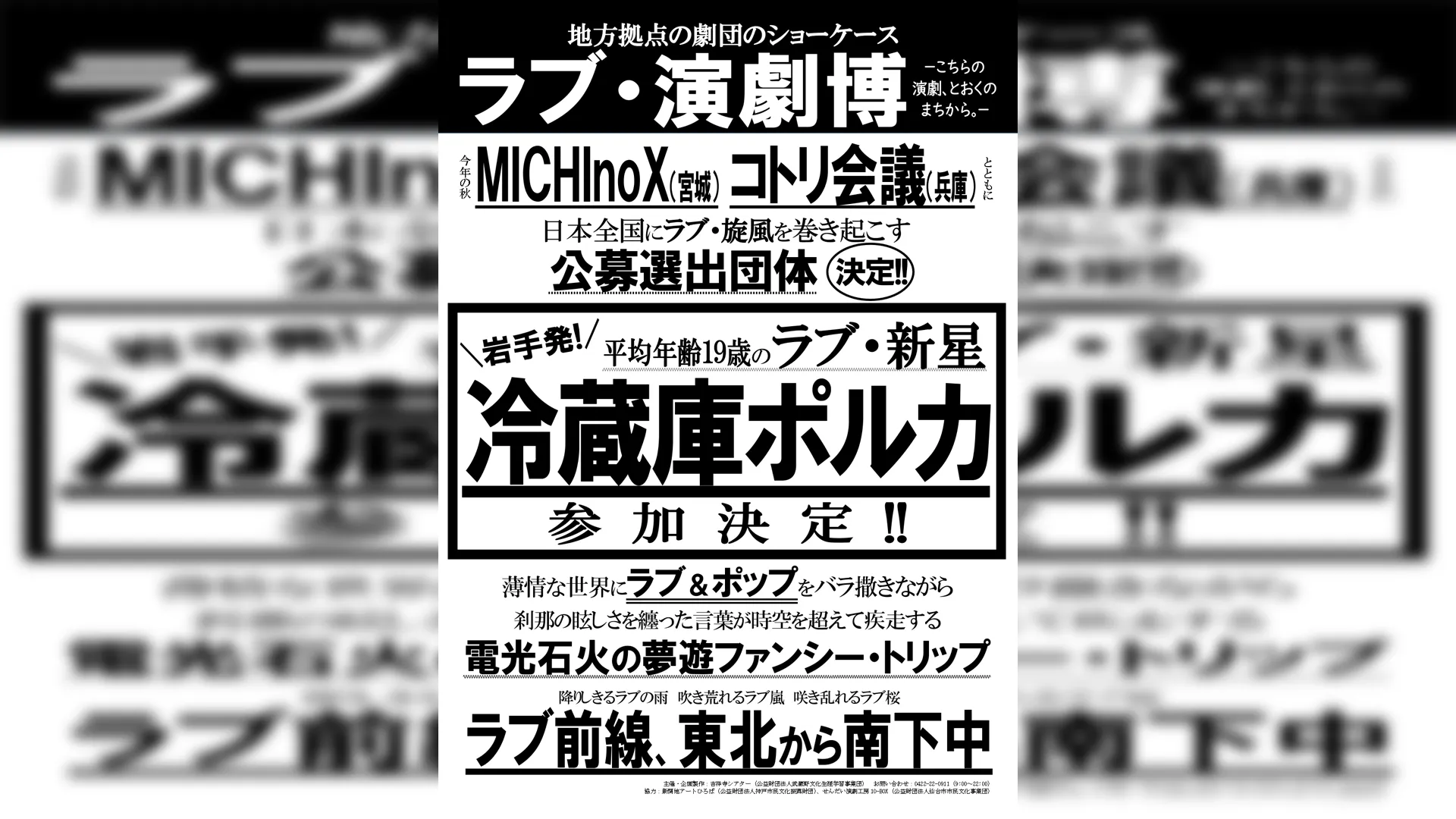 全国38団体の応募の中から書類 / 映像選考を経て選出されたのは、岩手県盛岡市を拠点に活動する劇団「冷蔵庫ポルカ」。平均年齢19歳のメンバーで構成される同劇団は、「どうしようもないあなたのための人間賛歌」を掲げて作品創作に取り組んでいる。
