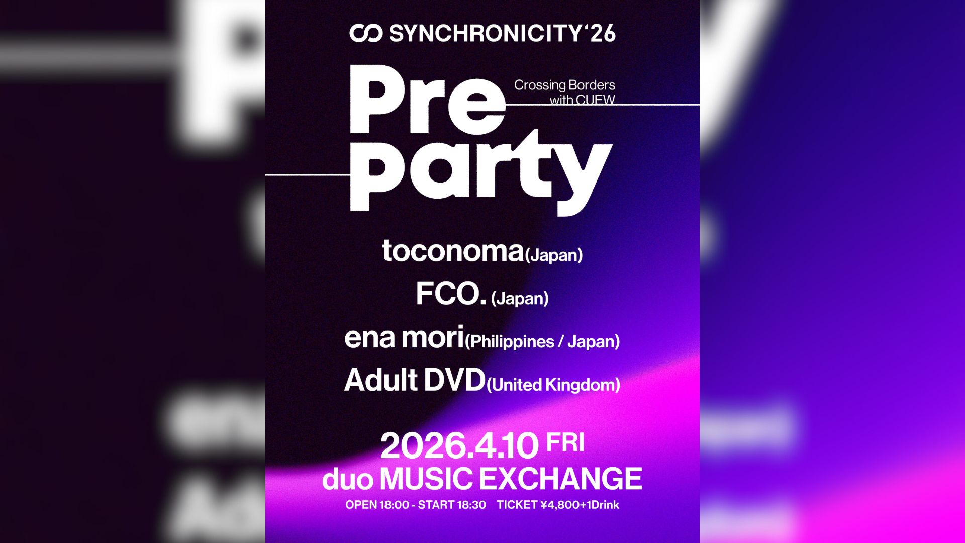 同イベントは、4月11日(土)・12日(日)に開催される『SYNCHRONICITY’26』の前夜祭で、国際音楽カンファレンス『CUEW』のアフターパーティーを兼ねて実施されるもの。『SYNCHRONICITY’26』出演アーティストの中から、toconoma(Japan)、FCO.(Japan)、ena mori(Philippines / Japan)、Adult DVD(United Kingdom)の4組が出演する。