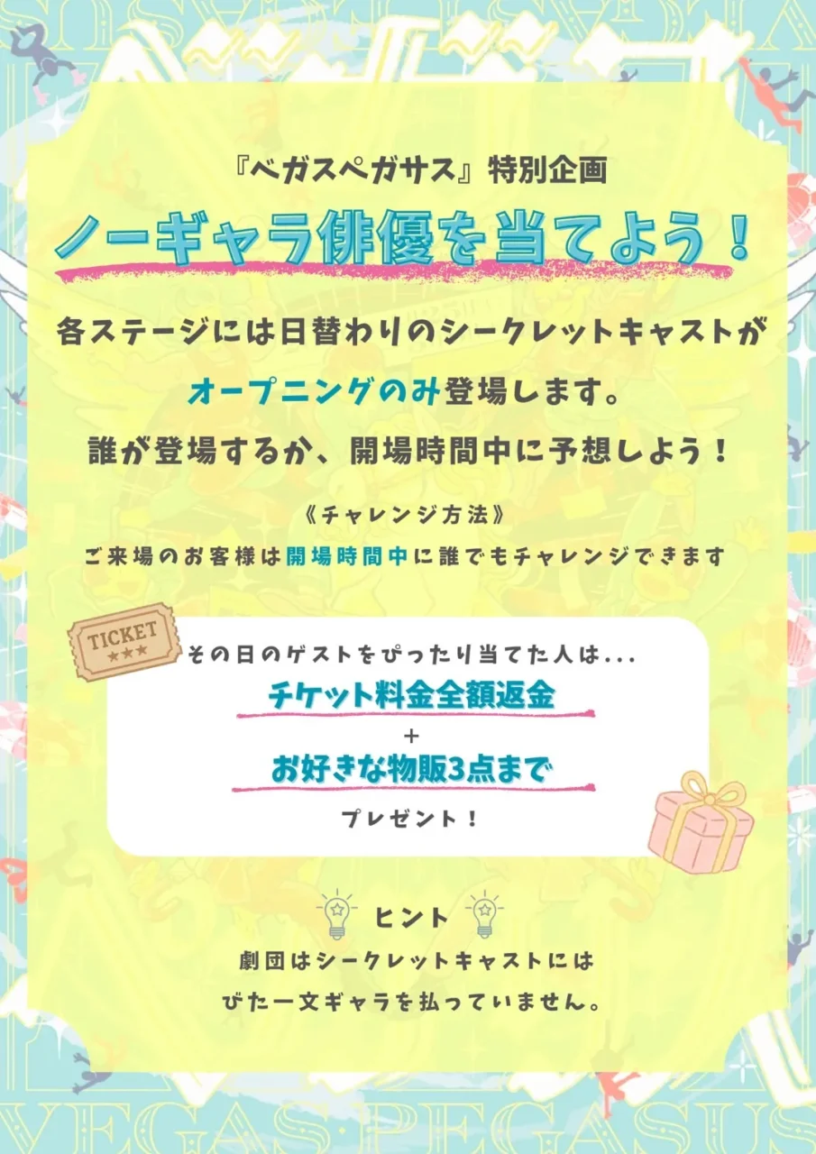 公演中には、オープニングにのみ出演する日替わりキャストを当てる企画が行われるほか、休演日には参加型の劇団イベントが予定されている。
