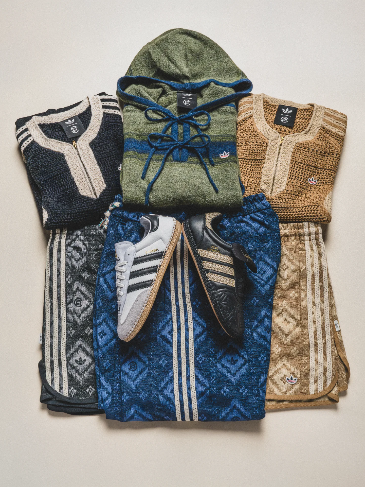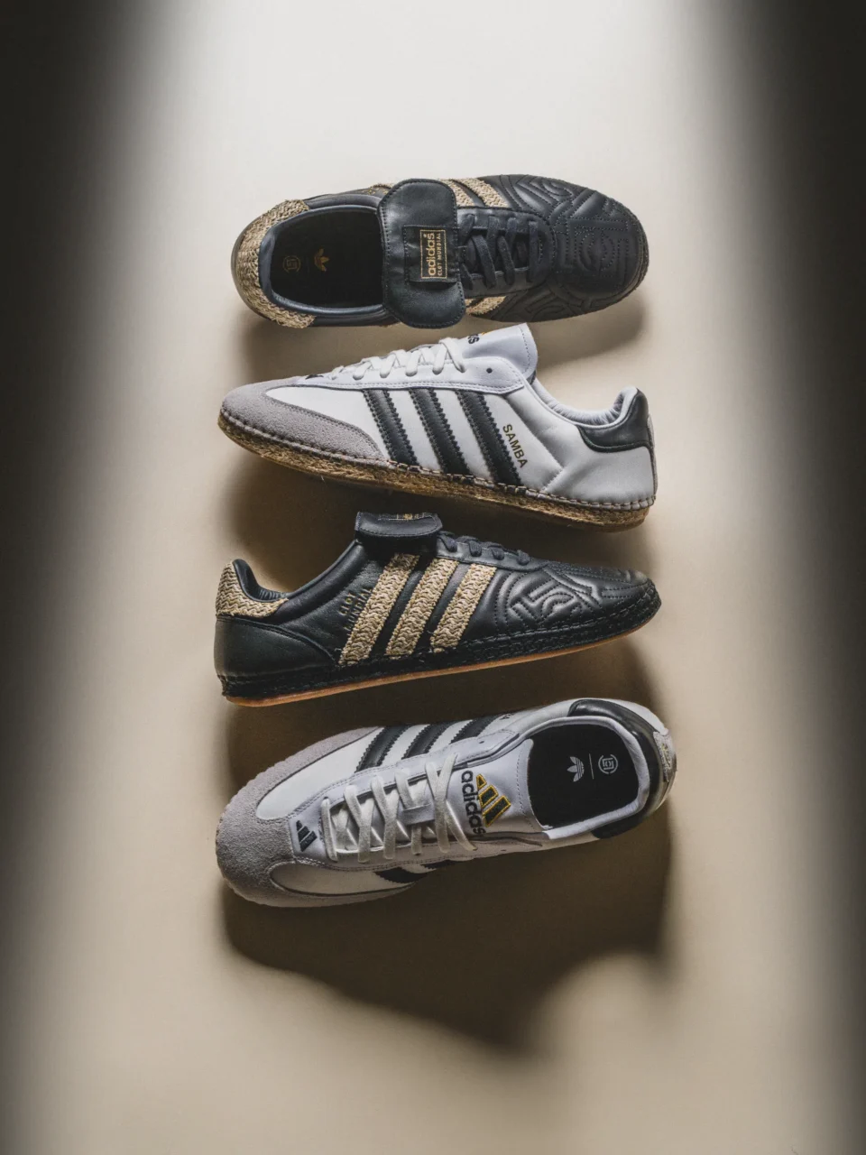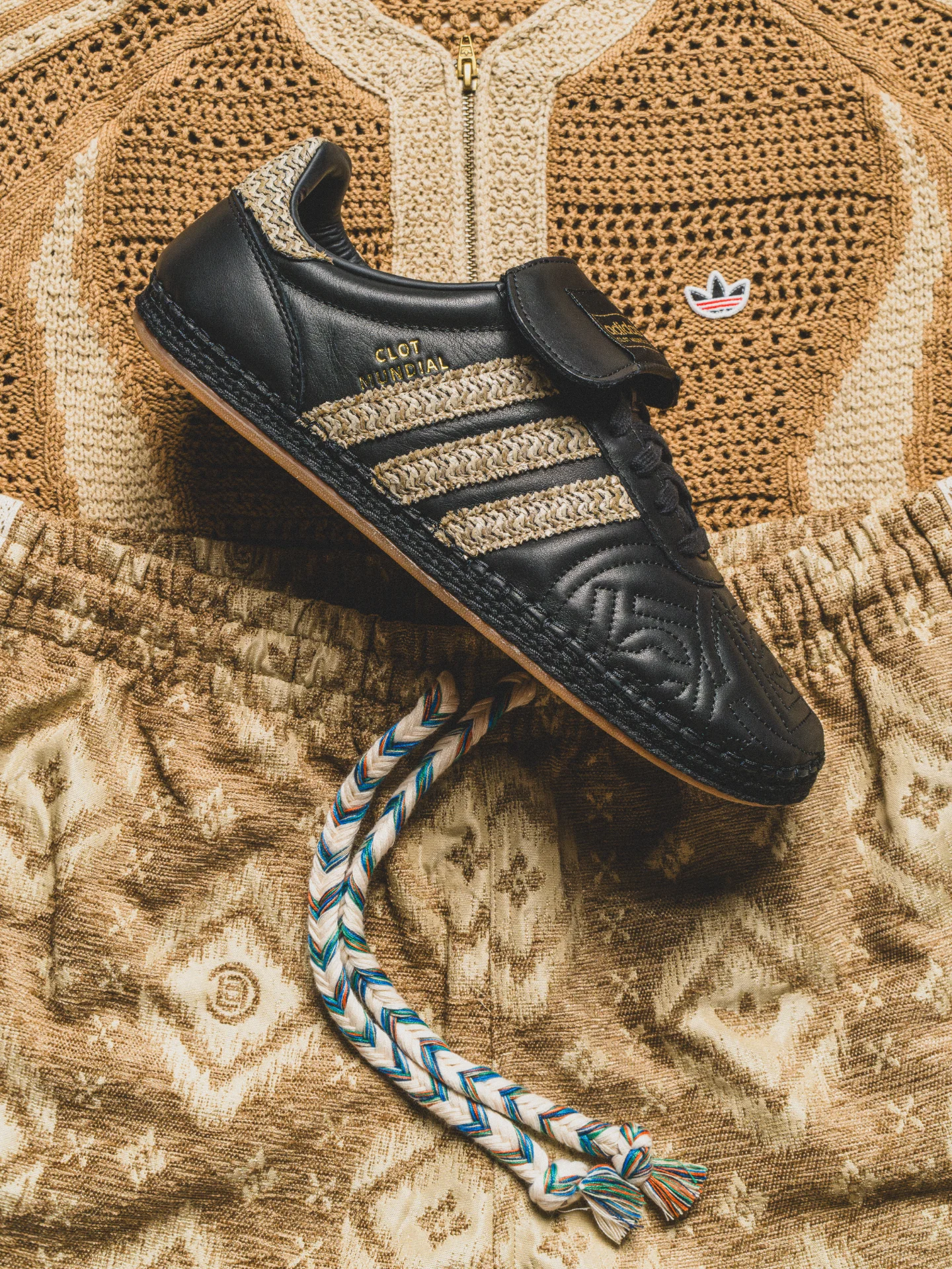 中心となるフットウェア「CLOT Mundial(クロット ムンディアル)」は、上質なレザーアッパー、ラフィア素材のスリーストライプス、エスパドリーユ風のソールを組み合わせ、クラシックなサッカーシューズの魅力を再解釈した一足。さらに「CLOT Sambaクロット サンバ )」は、「SAMBA MN(サンバ ミレニアム)」のアッパーをベースに、スエードのトゥキャップやラフィアのボトムが取り入れられている。