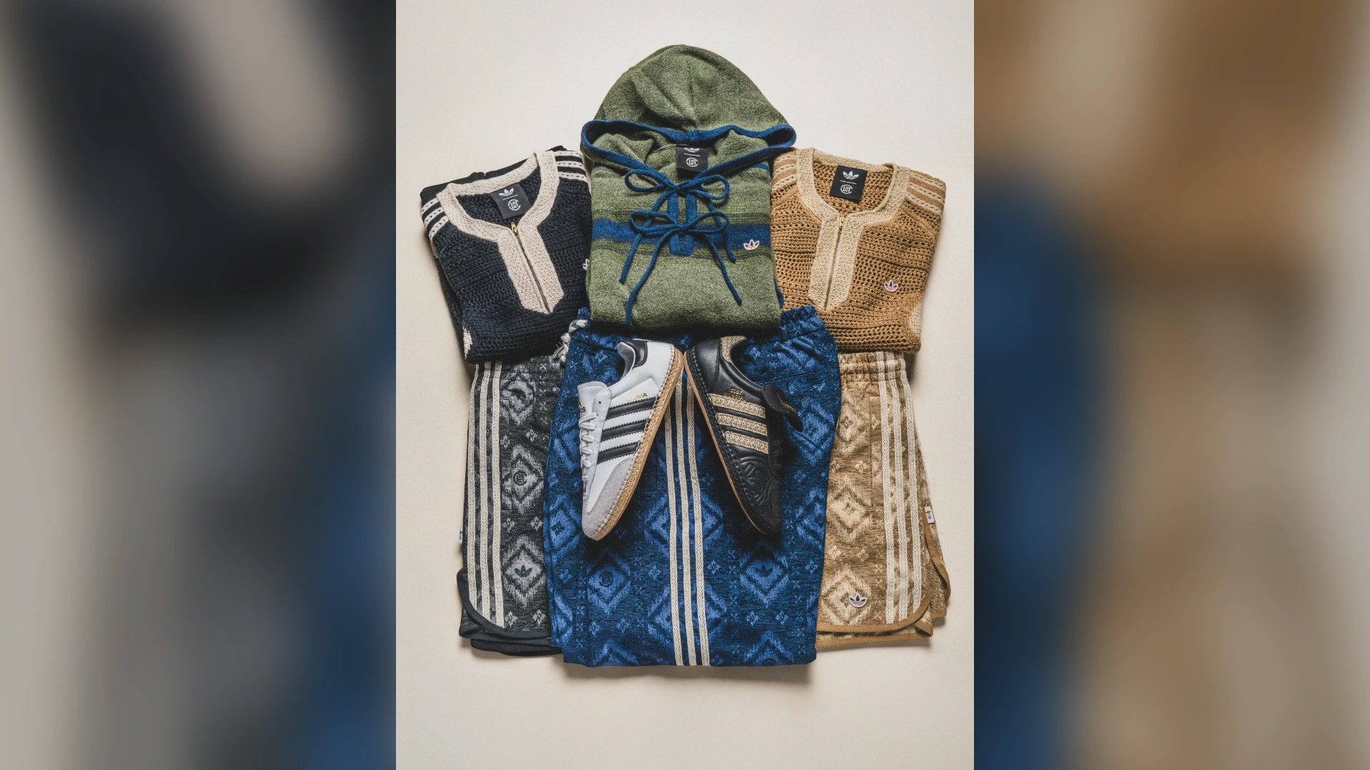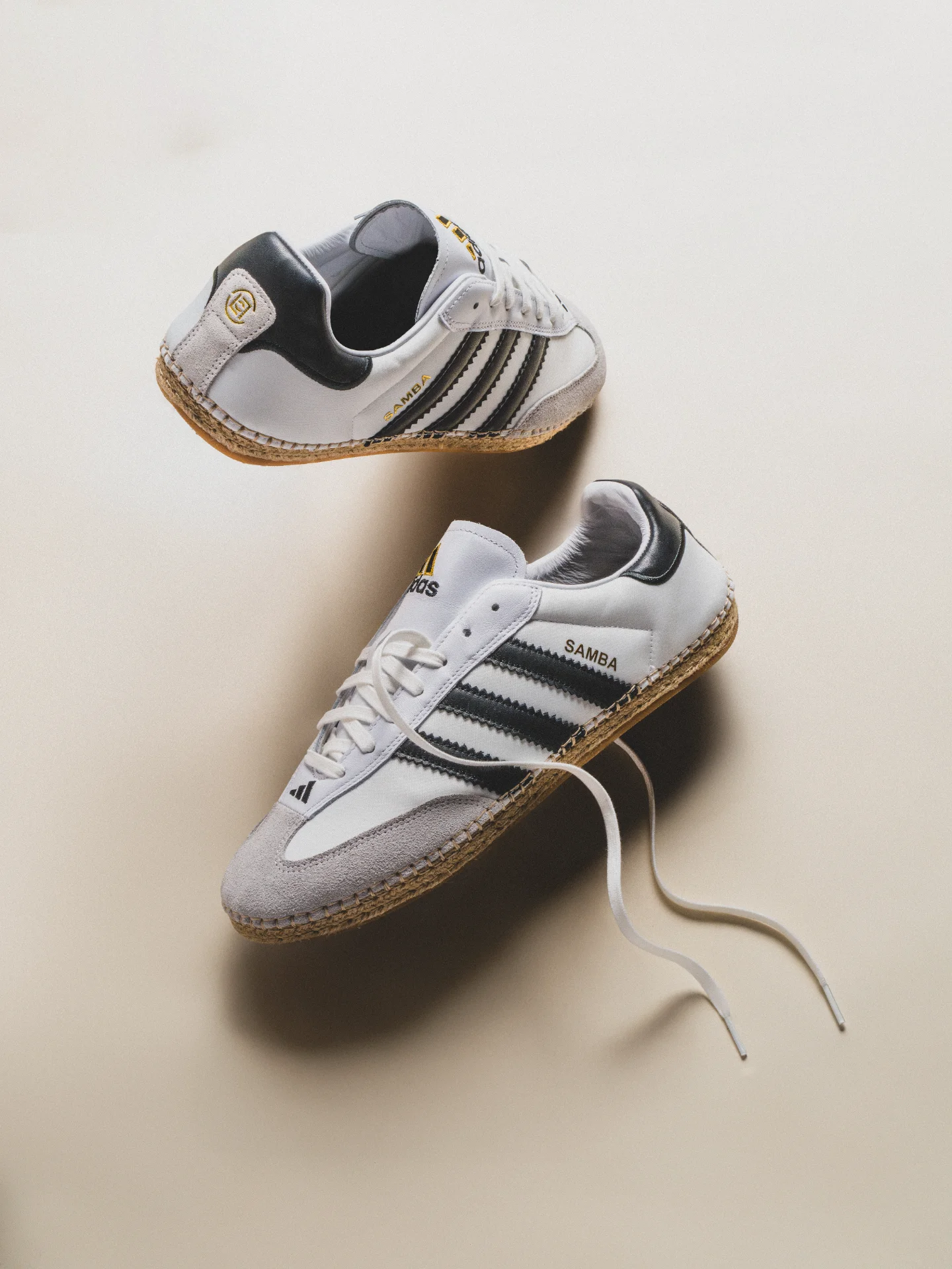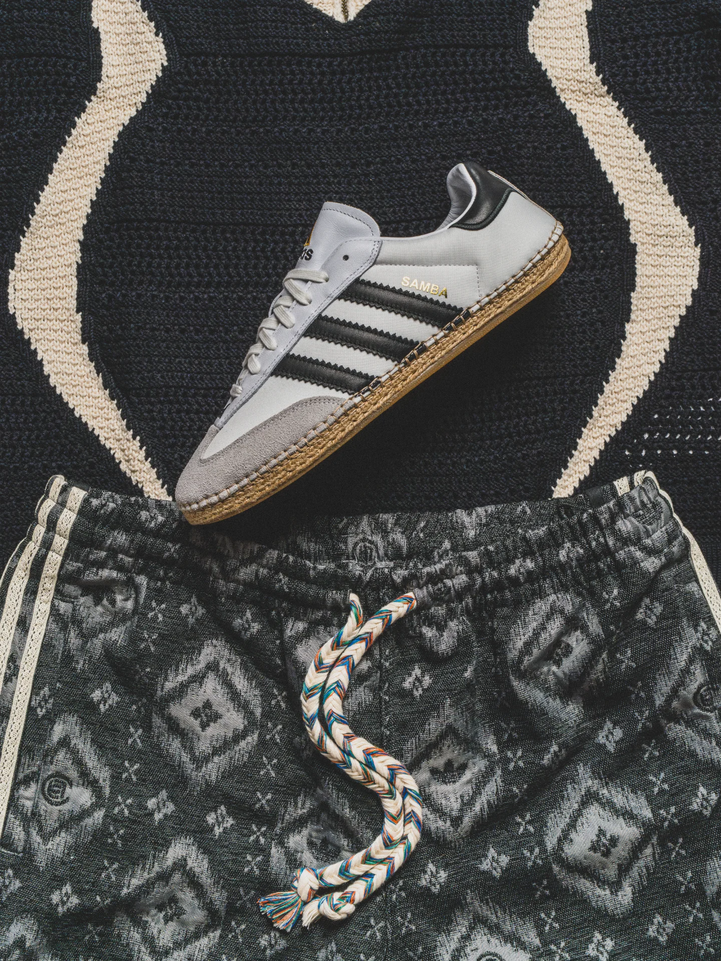 中心となるフットウェア「CLOT Mundial(クロット ムンディアル)」は、上質なレザーアッパー、ラフィア素材のスリーストライプス、エスパドリーユ風のソールを組み合わせ、クラシックなサッカーシューズの魅力を再解釈した一足。さらに「CLOT Sambaクロット サンバ )」は、「SAMBA MN(サンバ ミレニアム)」のアッパーをベースに、スエードのトゥキャップやラフィアのボトムが取り入れられている。