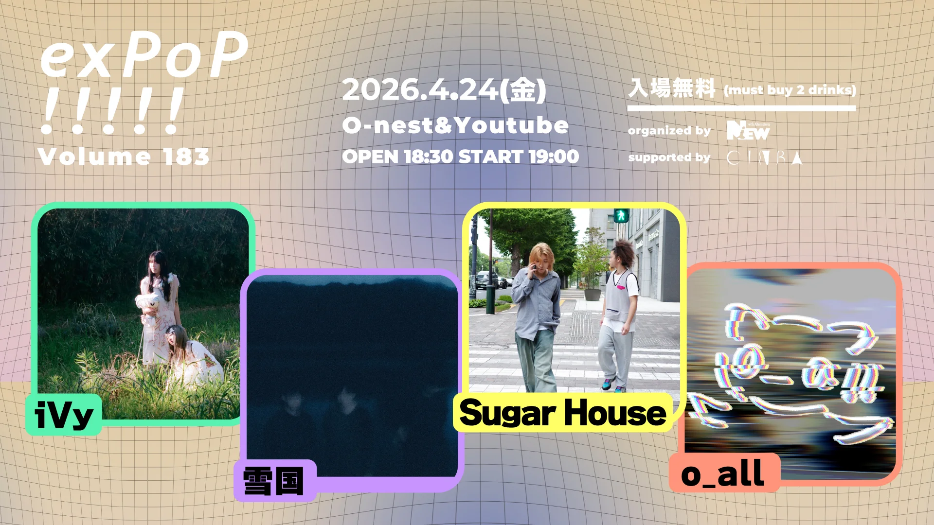 NiEWが手掛ける入場無料の音楽イベント『exPoP!!!!! Vol.183』が、3月27日(金)に東京・渋谷のSpotify O-nestで開催される。