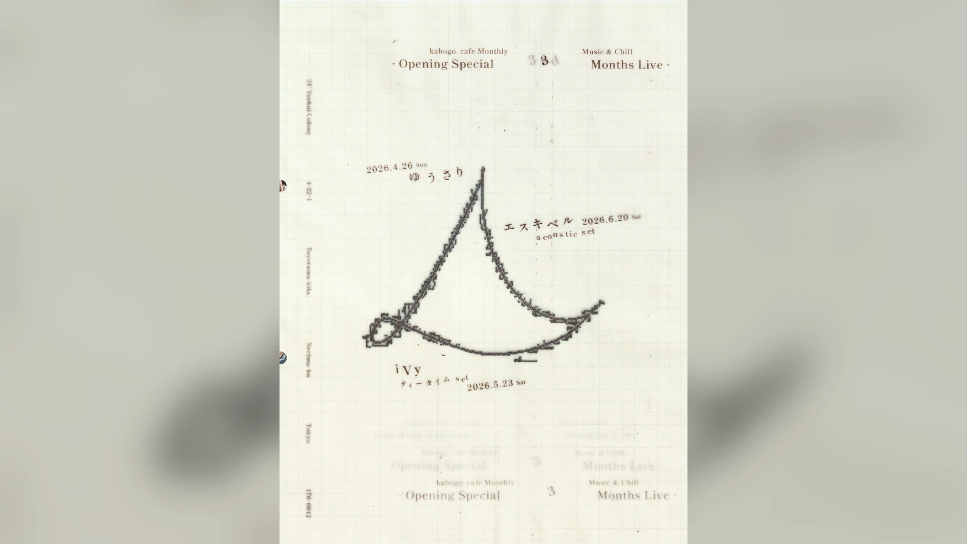 出演者は、木幡と縁の深い3組がラインナップされた。初日となる4月26日(日)には、昨年の『FUJI ROCK FESTIVAL ’25』の『ROOKIE A GO-GO』ステージで注目を集めたゆうさりが登場。続く5月23日(土)は、雪国のリリースパーティーにも出演したiVyが特別な「ティータイムset」を披露する。最終日となる6月20日(土)には、木幡自身がサポートドラムを務め、新EPのリリースを控えるエスキベルがアコースティック編成で出演。
