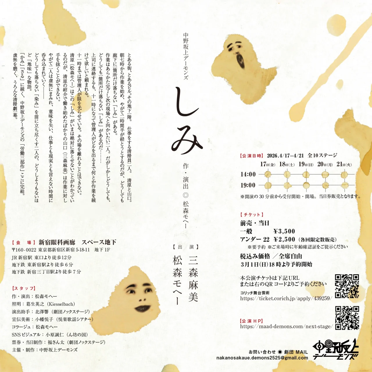 同公演は、『かみ』『さる』に続く、中野坂上デーモンズの「労働三部作」の完結編。とある街のビルの地下1階で仕事をしている2人の清掃員が、絶対に落ちない「しみ」を前に立ち尽くし、虚無にまみれ、意味を失い、仕事とも現実とも言えない時間に呑み込まれていくというストーリーの2人芝居となっている。