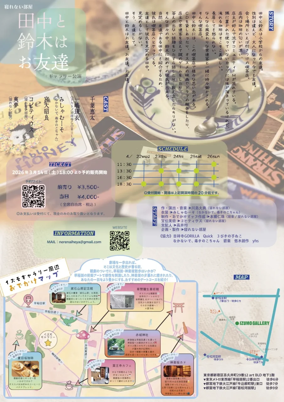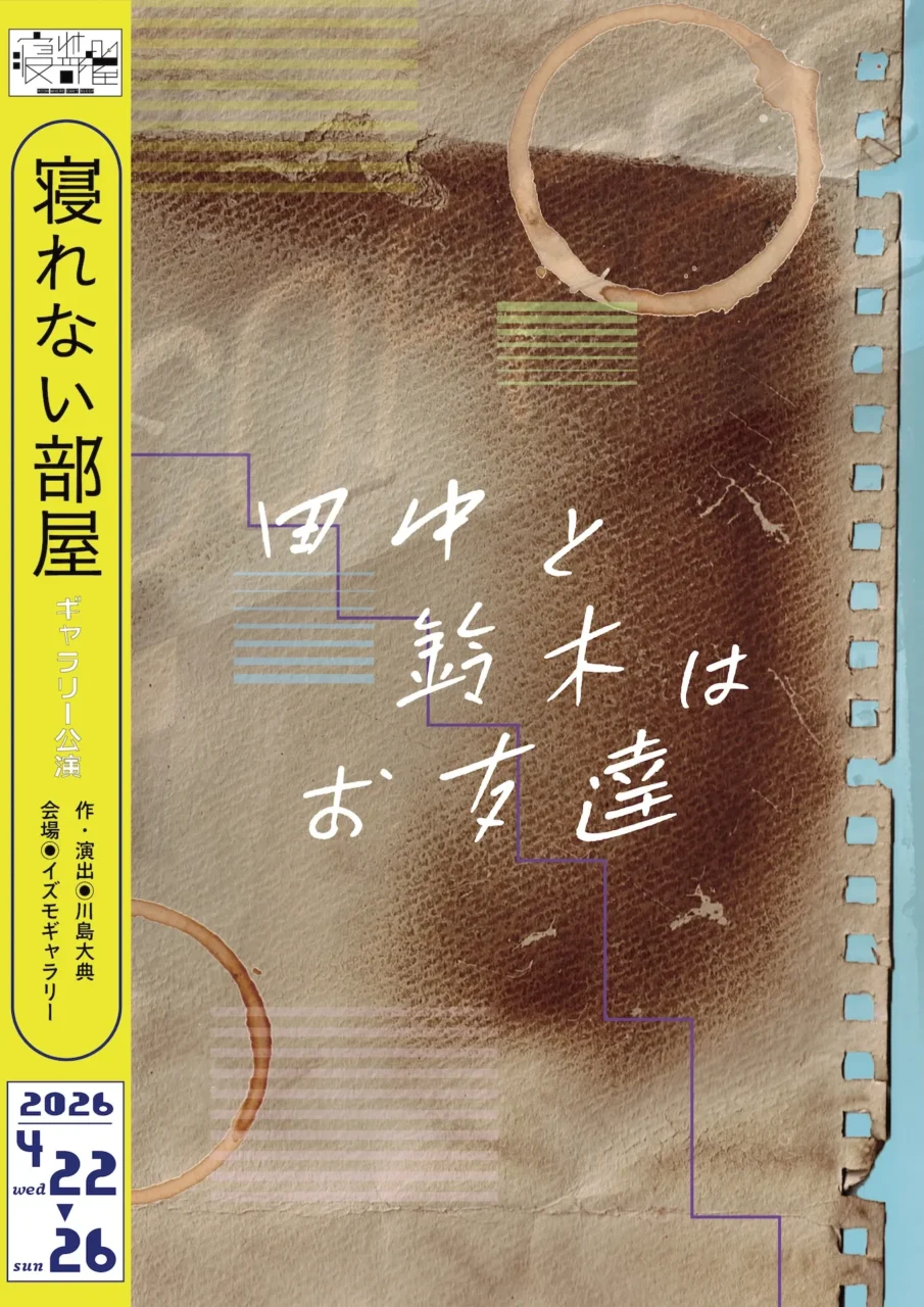 劇団「寝れない部屋」の舞台『田中と鈴木はお友達』が4月22日(水)から26日(日)に、東京・早稲田のイズモギャラリーで上演される。