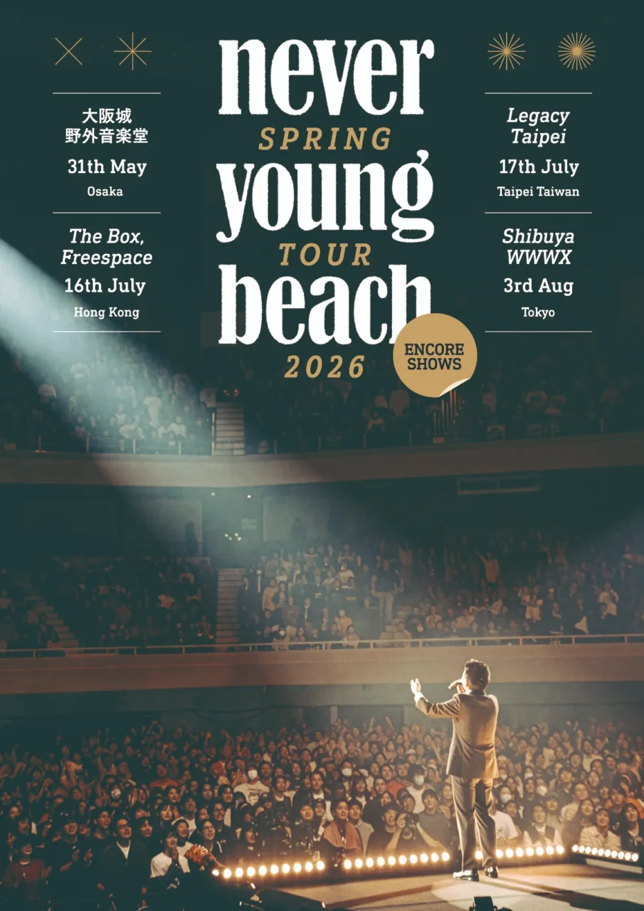 また、4月からスタートする全国ツアー『never young beach Spring Tour 2026』の追加公演として、台湾・香港を含む『never young beach Tour 2026 – Encore Shows -』の開催も発表された。5月の大阪城野外音楽堂を皮切りに、香港、台北を巡り、8月に東京・渋谷 WWW Xにてファイナルを迎える。