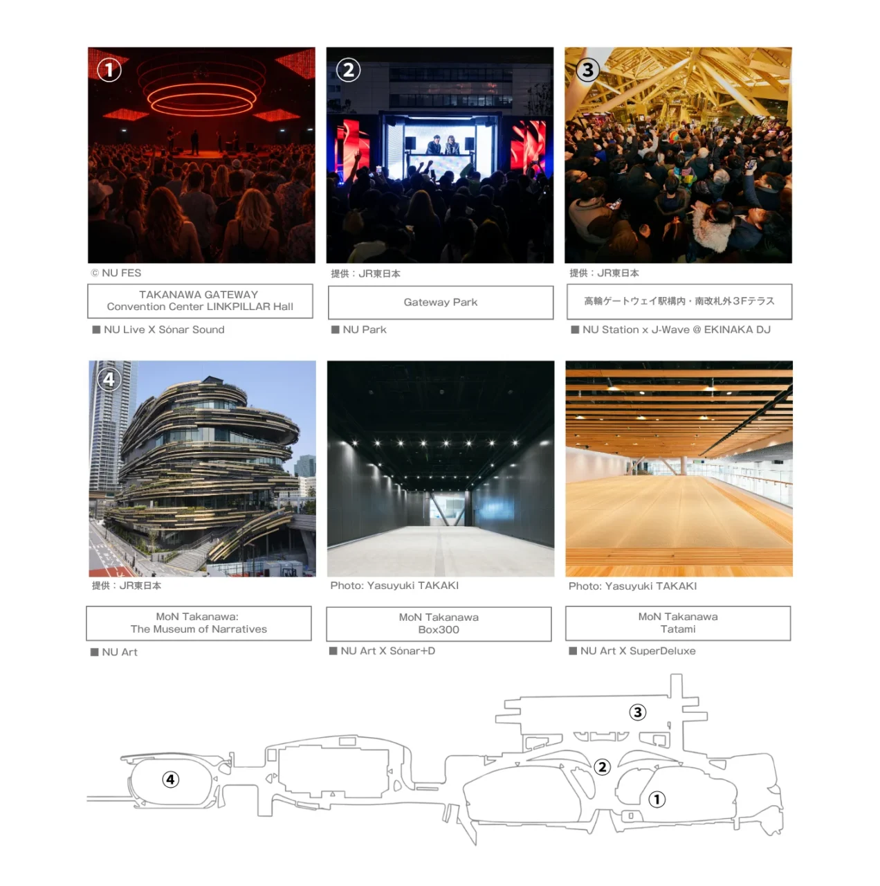 メイン会場となるTAKANAWA GATEWAY Convention Center内では、ライブ&DJの『NU Live』を開催。出演者には、ActressやDAITO MANABE、DJ KRUSHなどのアーティストが決定している。また、文化創造拠点「MoN Takanawa: The Museum of Narratives」では、最先端テクノロジーやアートの体験コンテンツ『NU Art』を実施。さらに、高輪ゲートウェイ駅構内ではJ-WAVEとのコラボレーションによる『NU Station』、駅前の「Gateway Park」では屋外イベント『NU Park』が行われる。