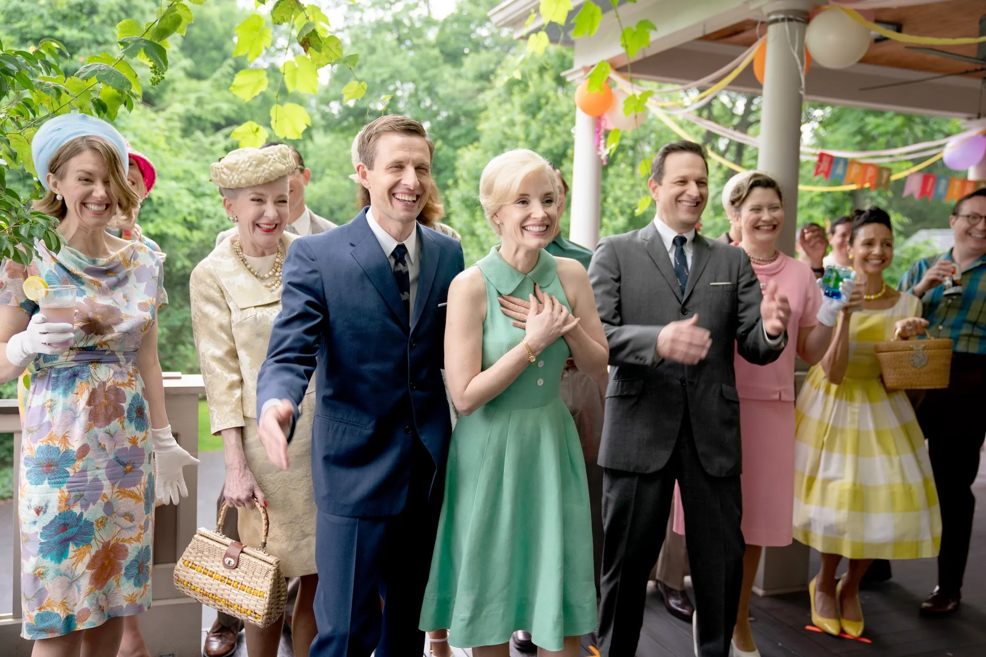 解禁されたシーン写真には、2人がガーデンパーティを楽しむ姿を捉えたカットのほか、1960年代前半のアメリカで流⾏した装いが収められている。上品で洗練されたレディライクなファッションと、その華やかでカラフルな装いの裏側で繰り広げられる壮絶な狂気のコントラストを、映画の公開に先駆けて見ることができる。