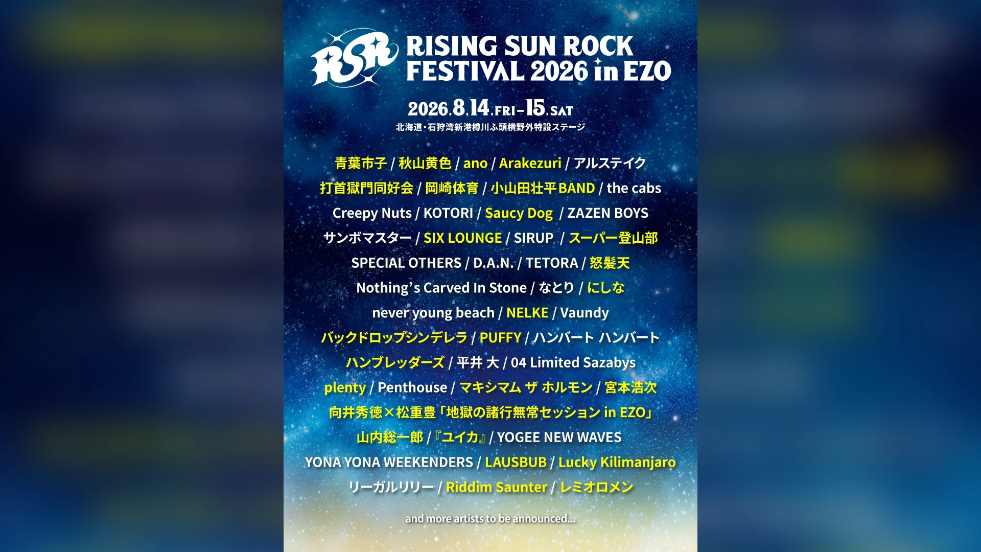 8月14日(金)、15日(土)に北海道で開催される野外フェス『RISING SUN ROCK FESTIVAL 2026 in EZO』の第2弾出演アーティストが発表された。