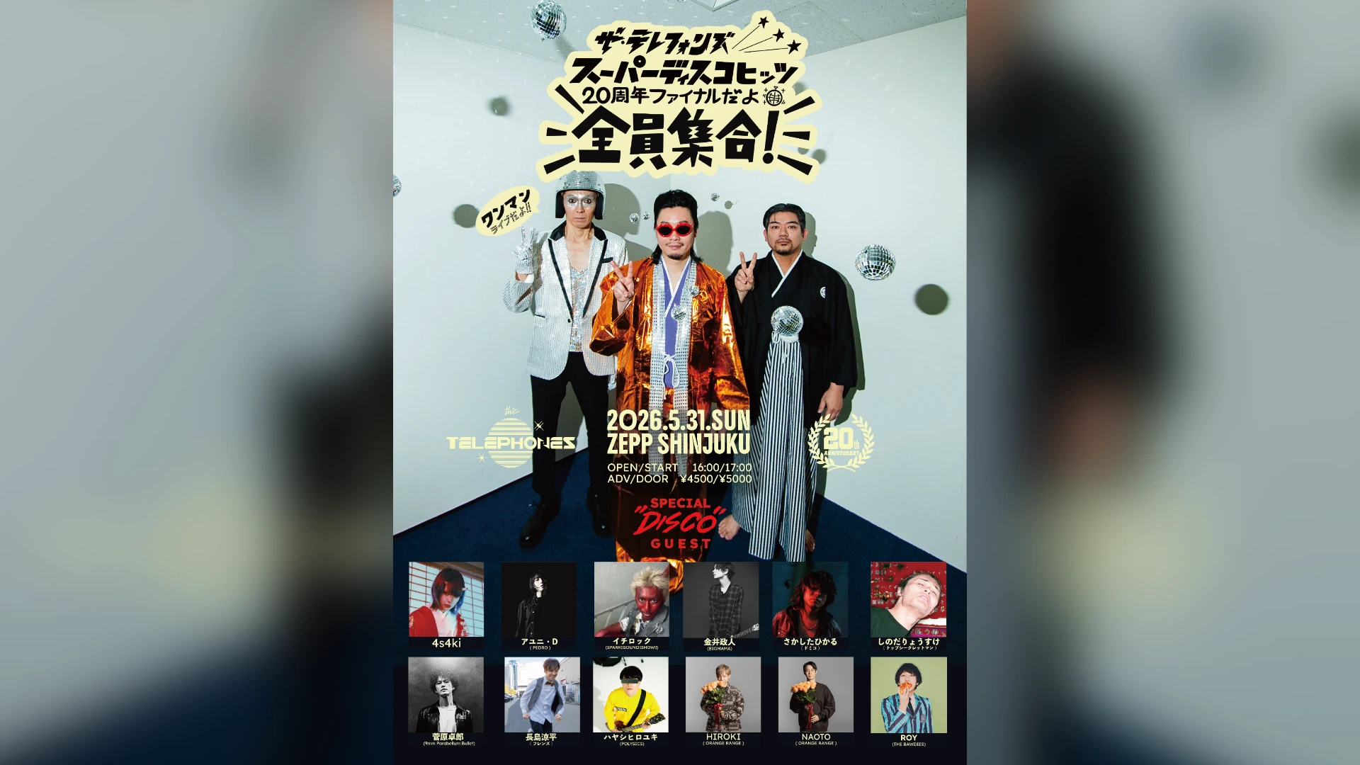 あわせて、5月31日(日)に東京・Zepp Shinjukuで開催されるワンマンライブ『SUPER DISCO HITS!!! -20周年ファイナルだよ、全員集合!!-』の最終ゲストが発表された。今回出演が決定したのは、親交の深いBIGMAMA金井政人と元the telephonesのベーシスト・長島涼平の2名。長島の出演は、本人から「20周年のワンマンでベースを弾きたい」と提案したことで実現したという。