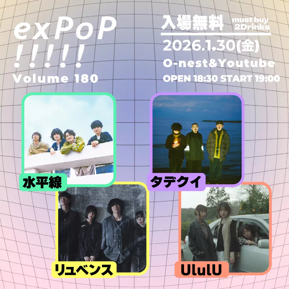 NiEWが手掛ける入場無料の音楽イベント『exPoP!!!!! Vol.180』が、2026年1月30日(金)に東京・渋谷のSpotify O-nestで開催される。