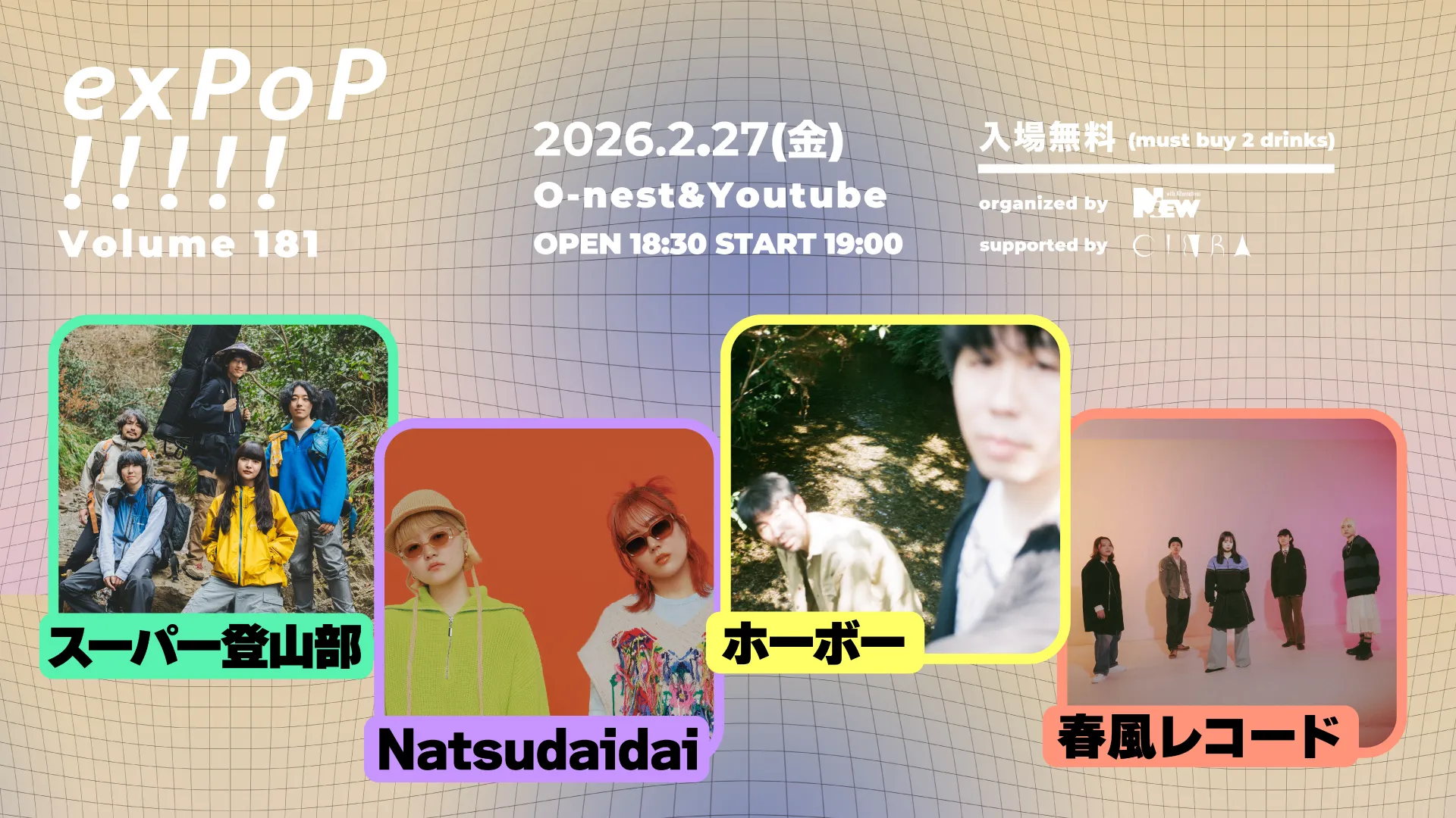 NiEWが手掛ける入場無料の音楽イベント『exPoP!!!!! Vol.181』が、2月27日(金)に東京・渋谷のSpotify O-nestで開催される。