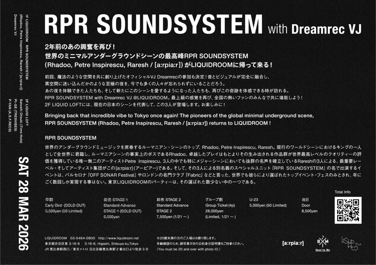 RPR SOUNDSYSTEMは、Rhadoo、Petre Inspirescu、Rareshの3人によるスペシャルユニット。ルーマニアのミニマルアンダーグラウンドシーンを象徴するレーベル「[a:rpia:r]」を運営し、バルセロナの『OFF SONAR Festival』やロンドンの『Fabric』など、世界各地のフェスティバルやクラブで活動している。