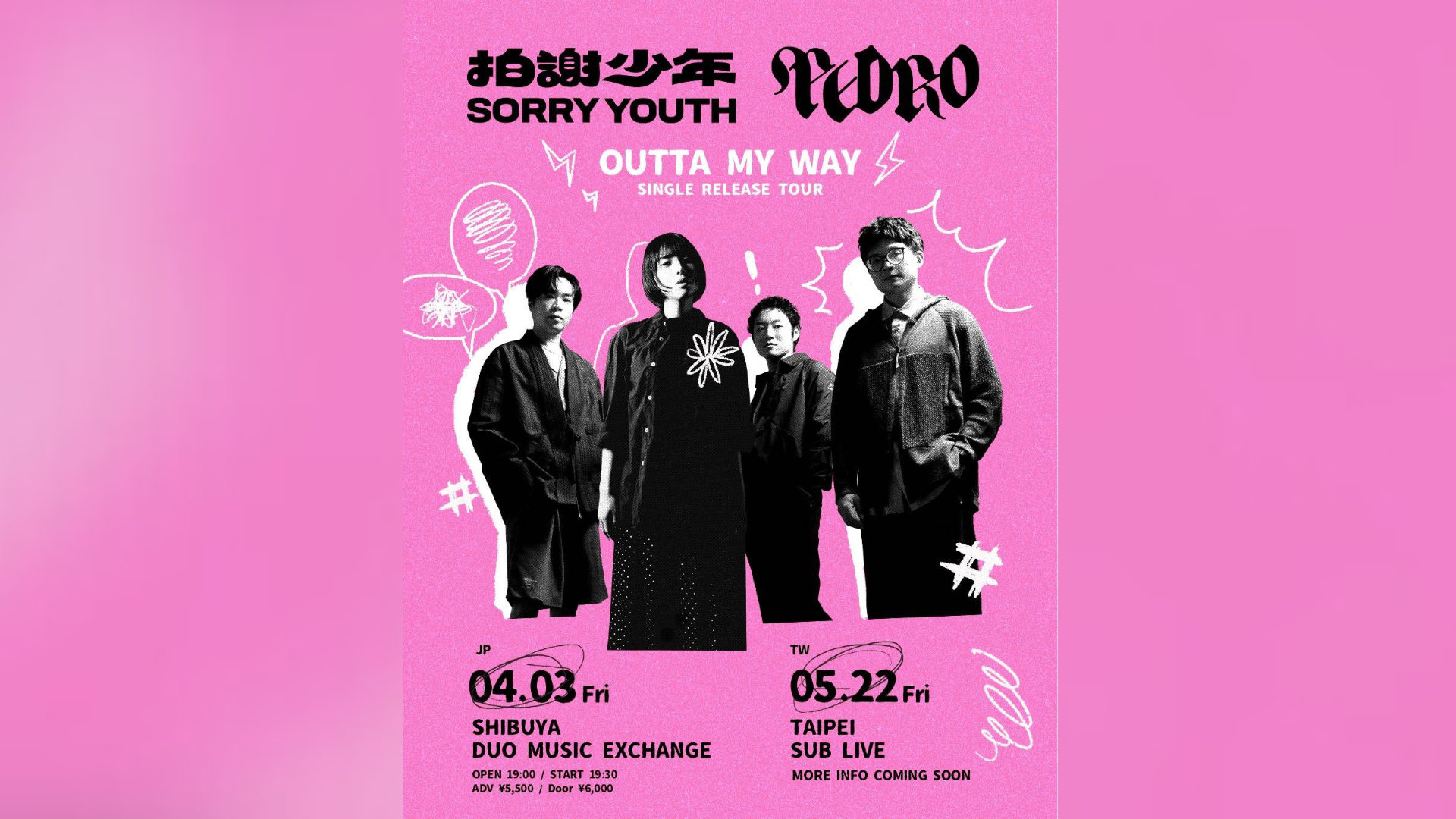 台湾の音楽シーンを牽引する3ピースバンド・Sorry Youth(拍謝少年)と、アユニ・Dによるバンドプロジェクト・PEDROによる2都市ツアー『Sorry Youth x PEDRO “Outta My Way” Release Tour 2026』の開催が決定した。