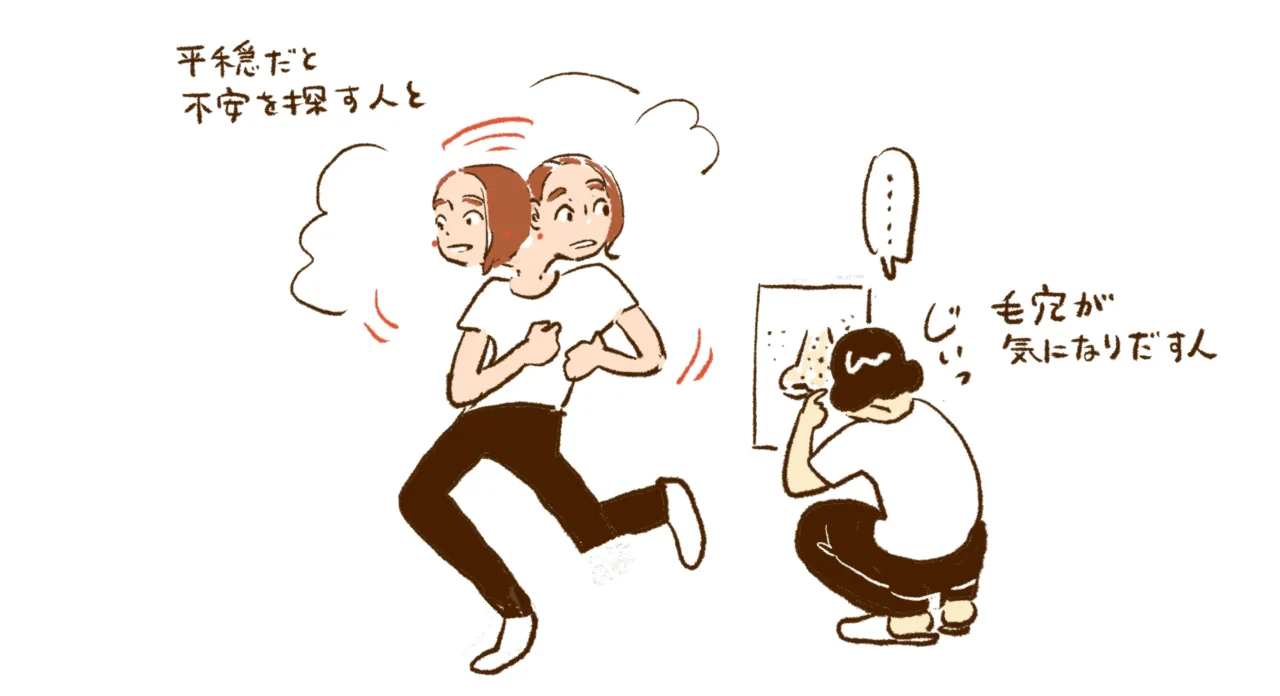 鳥飼:そうかもしれない。「問題がないわけがない」って思っているんですね。それで、そんなに心配しなくてもいいようなところに「これはもしかして不安の種なんじゃないか」みたいにフォーカスしていっちゃう。だから、平和な生活をしている方が、不安がいっぱいになってくるんだよね。でも、旅とかに出ている間は、うまくいかなくて当然だと思ってるから、自分から不安を探す余裕はないじゃん。順番が変わるんだよね。