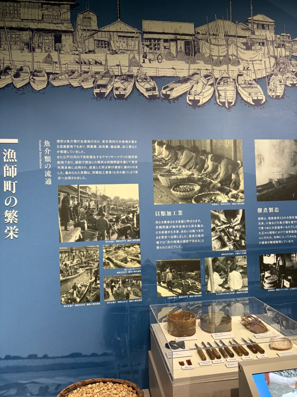 さて展示はやはり「干潟の町・浦安」を知るところから始まる。埋め立てられる前の浦安は今の4分の1くらいしか陸地がなくて、その先は1200ヘクタール(東京ドーム260個分)に及ぶ広い干潟と遠浅の海だった。そこで海苔養殖や貝を取って剥いて佃煮などに加工して流通させるって産業を中心に町が発展した。