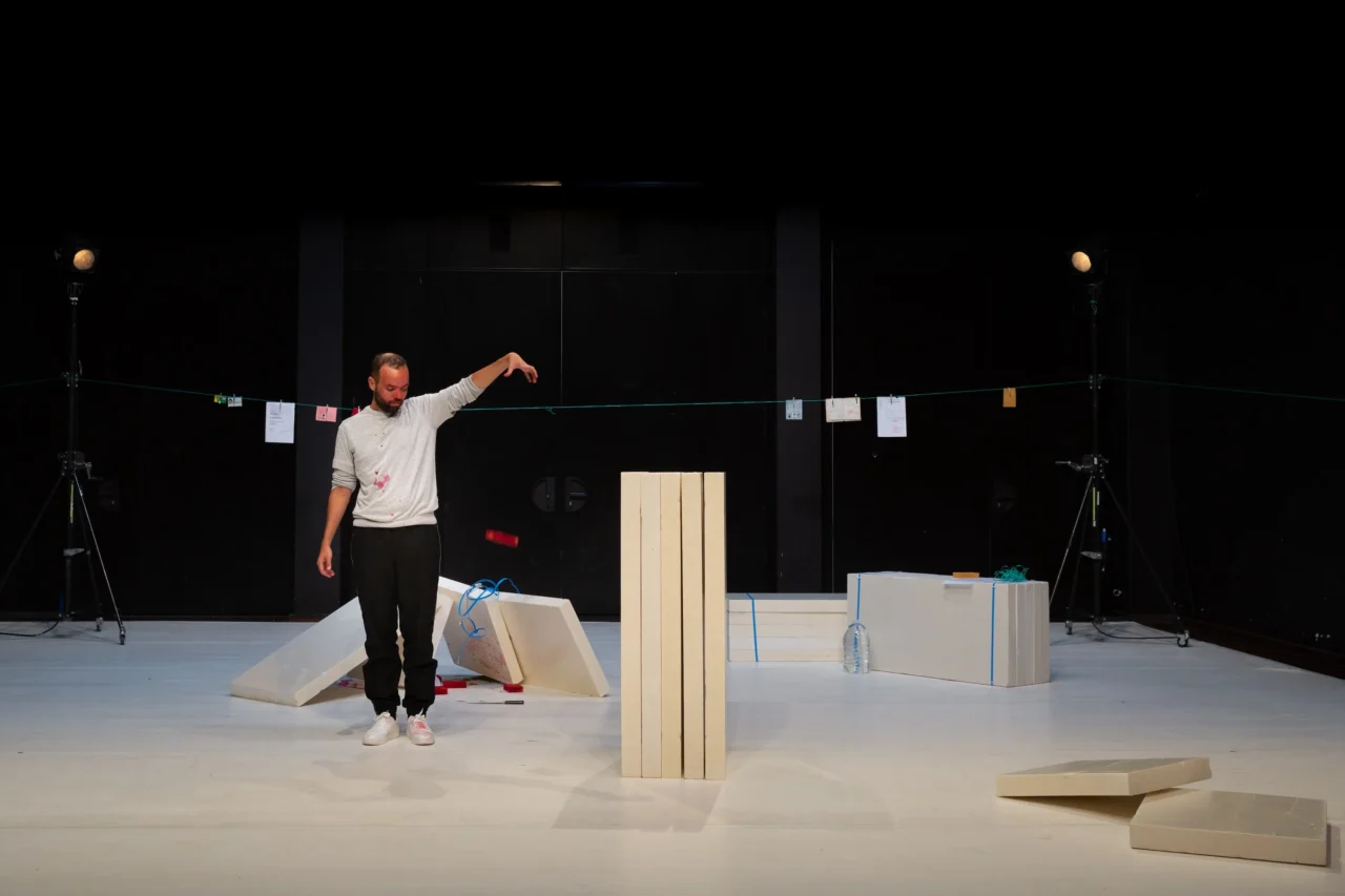 この作品は、アルジェリア出身で、現在はベルギーに住むサリム・ジャフェリ(Salim Djaferi)というアーティストによるレクチャーパフォーマンス。ここでは、「Colonization(植民地化)という言葉に対する適切なアラビア語訳を探していくという物語をメインに、アルジェリアの書店で、アルジェリア戦争の関連書籍が「戦争」の棚ではなく「革命」の棚に分類されていたこと、彼の祖父や母がよりよい職を得るためにアラブ系の名前から西洋系の名前に変えてきたエピソードなど、西欧の生み出してきた「歴史」に対していかにアラブ系の人々が翻弄されてきたのかが見えてくる。以前から、国際演劇祭の現場に足を運ぶと、西洋人がアジア人などの有色人種を「使い」ながら、形ばかりの「脱植民地化」に留まる作品が多いことが以前から気になっていた。けど、この作品は、西欧の視点からではなく、彼らの視点から、彼らのコミュニティに向けて語られていたのが印象的だった。