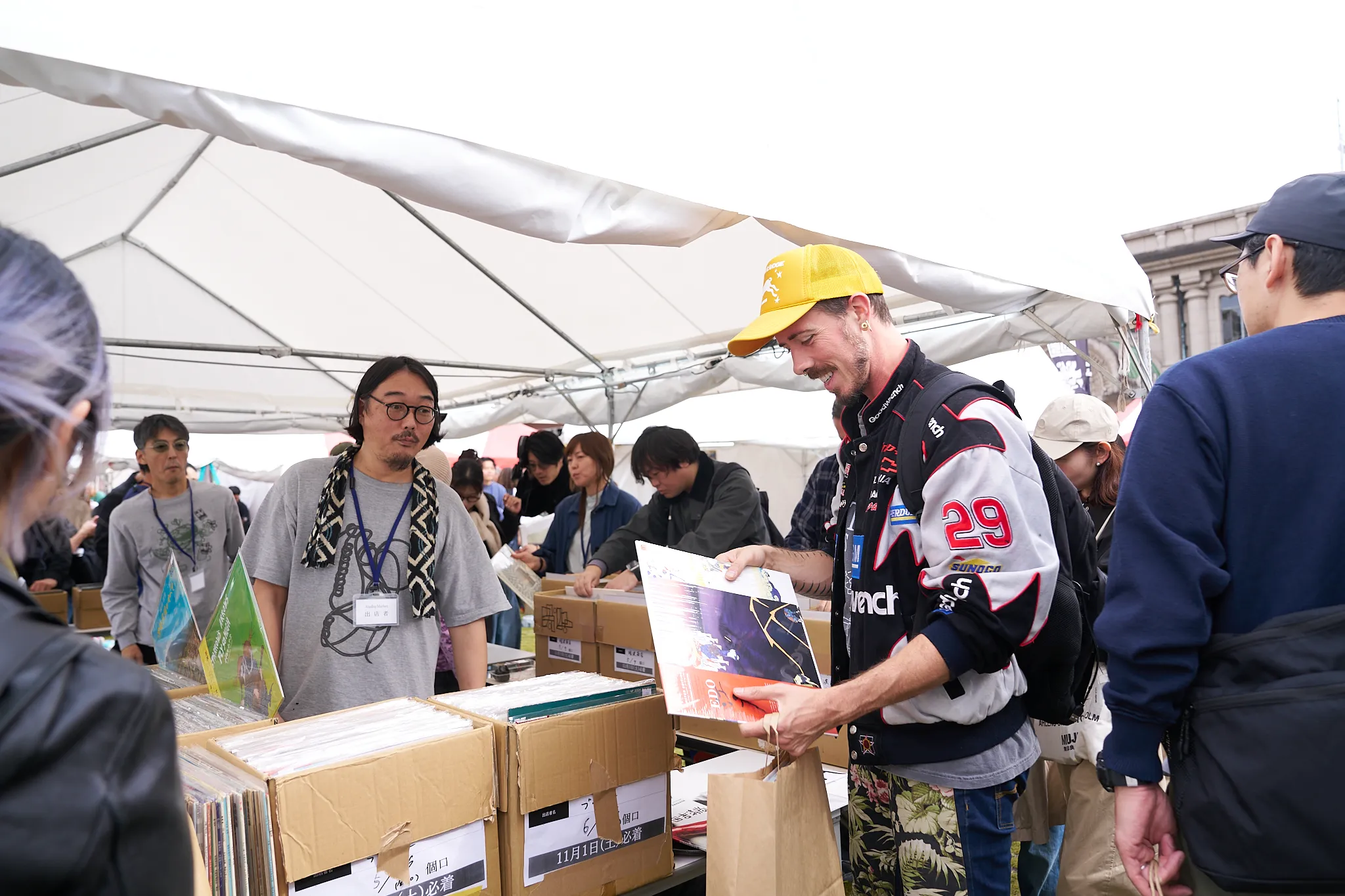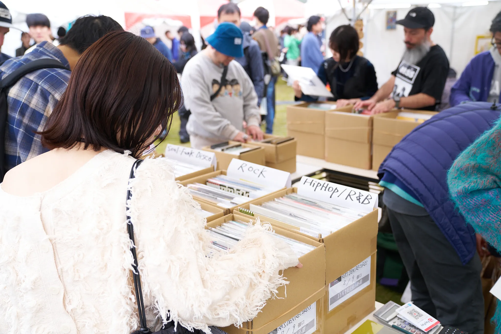 1000円均一の特価盤からTシャツ、トートバッグ、海外の音楽ファンジンや写真集まで並び、音楽を軸にカルチャーが広がっている。どのブースにも1台ずつAudio-Technica製のターンテーブルが設置されており、来場者は誰しもレコードを自由に試聴できる。レコードを熱心に漁りながら、店主との会話も楽しむその様子には、クリックひとつで音楽が聴ける今の時代でも、自分の手で探し、人と話しながら「これぞ」という1枚に出会う──そんなアナログレコード店ならではの喜びが溢れていた。