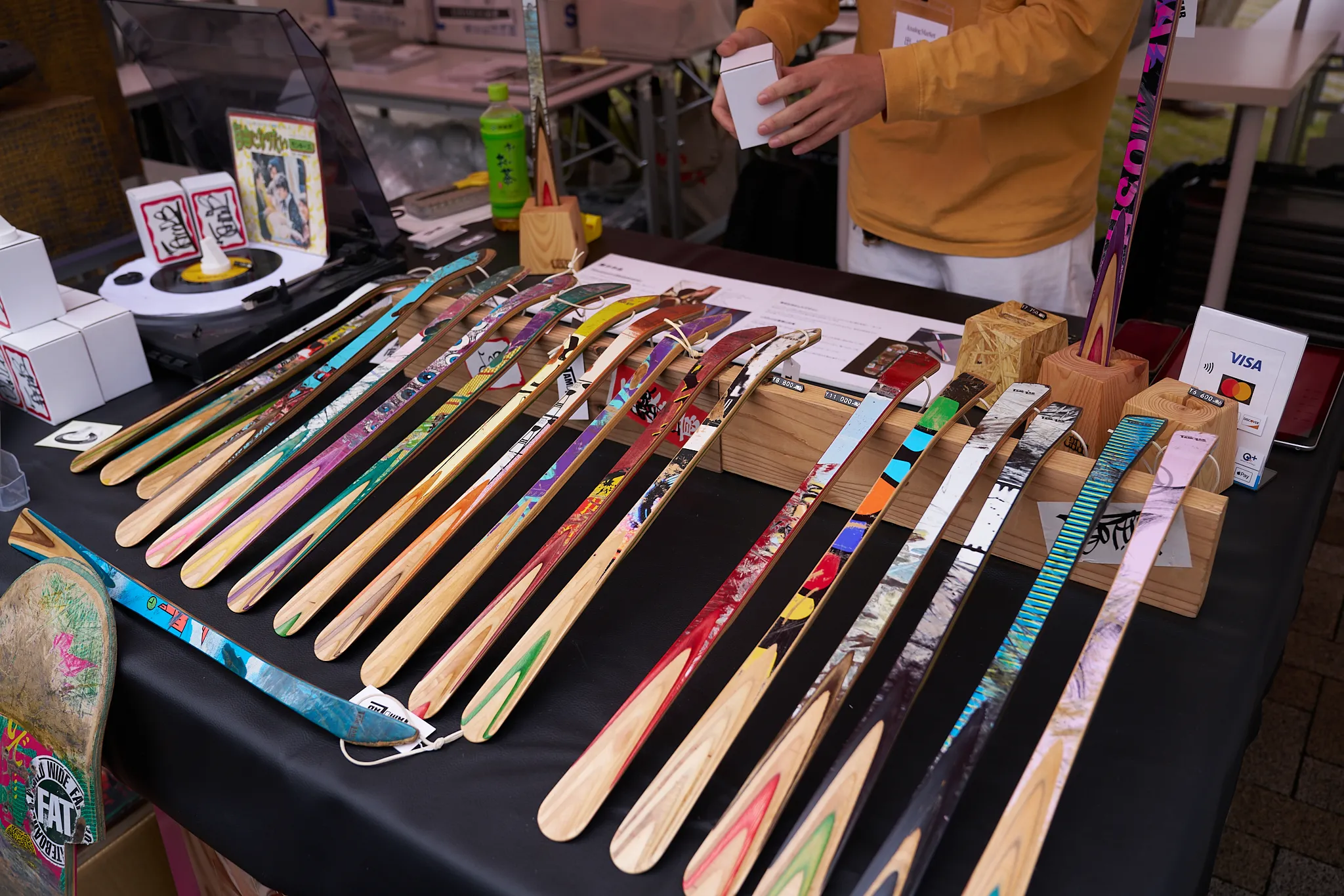 レコードショップのみならず、マーケットエリアにはアナログ的なこだわりを感じさせる品々が目を引いた。能登の古民家から救い出された古道具ショップ「のとのいえ」、かつて街を駆け抜けたスケートボードの廃材で作られた靴べらを置く「TAMILAB」、月の満ち欠けに合わせて仕込む自然派ワインの店「Domaine Hide」、創業約300年の老舗お香メーカー「松栄堂」の移動販売車「Incense Station ことことワゴン」等々──いずれも人の手の温もりと感性が宿るものばかりだ。