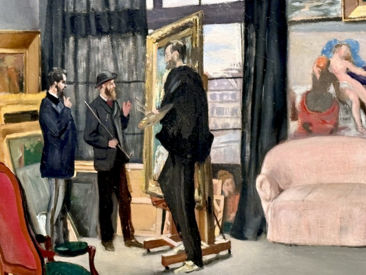 中央に立つ背の高いバジールの姿は、マネによって描き加えられたものだという。いわれてみれば、この人物像だけ黒色が鮮やかで、タッチがちょっと違うような……絵筆のスピードを感じさせる、マネらしいシャープなラインに注目してみてほしい。
