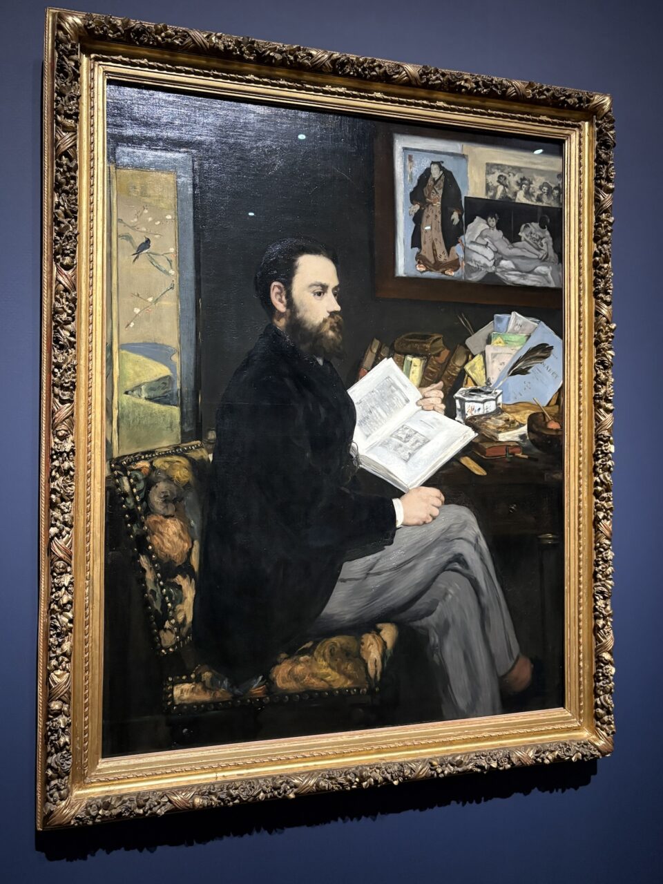 美術史の授業で必ずといっていいほど出てくる、マネ『エミール・ゾラの肖像』にもこの章で会える。センセーショナルな作品を発表して炎上していたマネを評価、擁護する意見を著したゾラへ、マネが感謝の気持ちを込めて描いたというこの肖像。背景には問題作『オランピア』(※)や、ゾラによるマネ評論の冊子、両者が深く関心を寄せていた日本美術の作品などが掲げられている。
