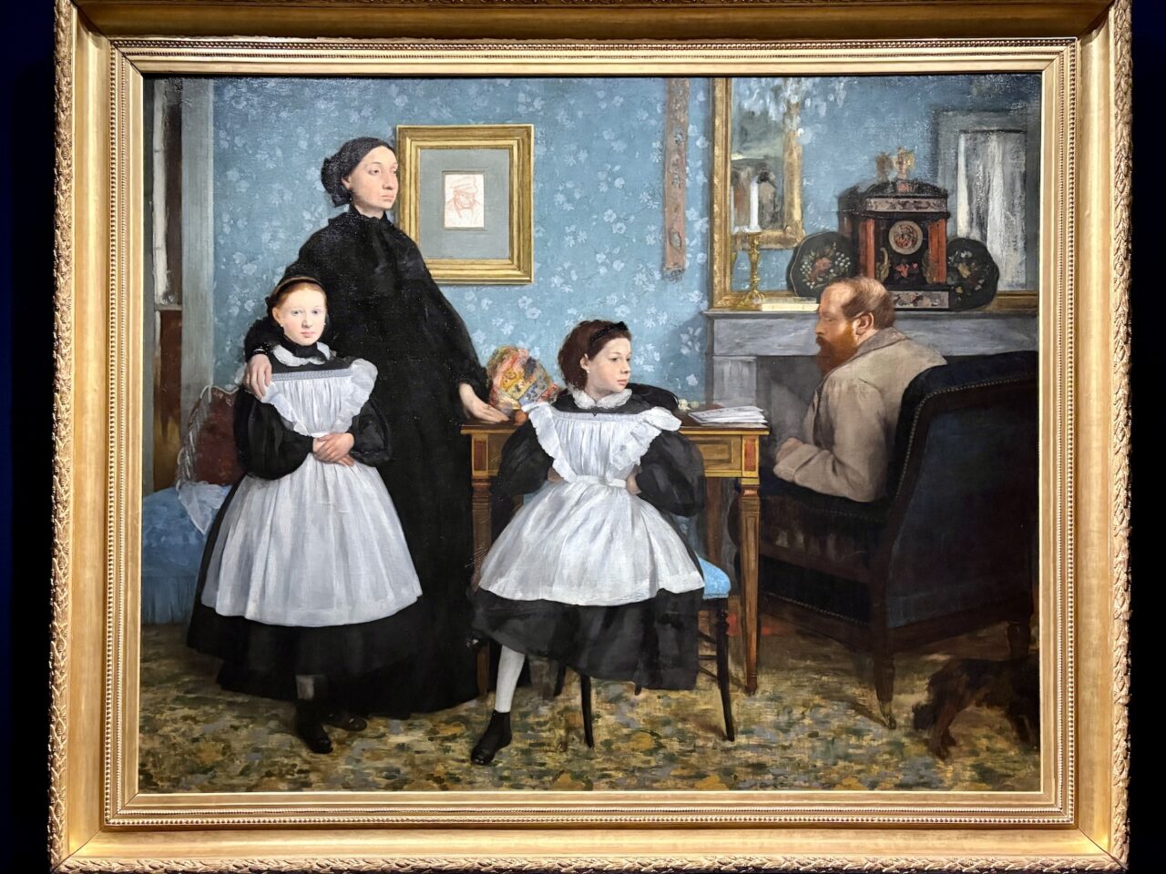 描かれているのは、イタリアに亡命中だったドガの叔母一家。ひと目で、家族全員がバラバラの方を見ていることに気づくだろう。とある家庭のリアルな力関係を感じさせる、緊張感に満ちた傑作である。よく見ると画面右下には出て行こうとしている黒っぽい子犬が。子犬は伝統的な愛の象徴だから描かれているのか、それとも本当にこの場の空気に耐えられず出て行ったペットがいたのか……どちらにせよ、わざわざ見切れた状態で描き込むあたりにドガの意地悪さ(冷徹な観察者ぶり)を感じないだろうか。