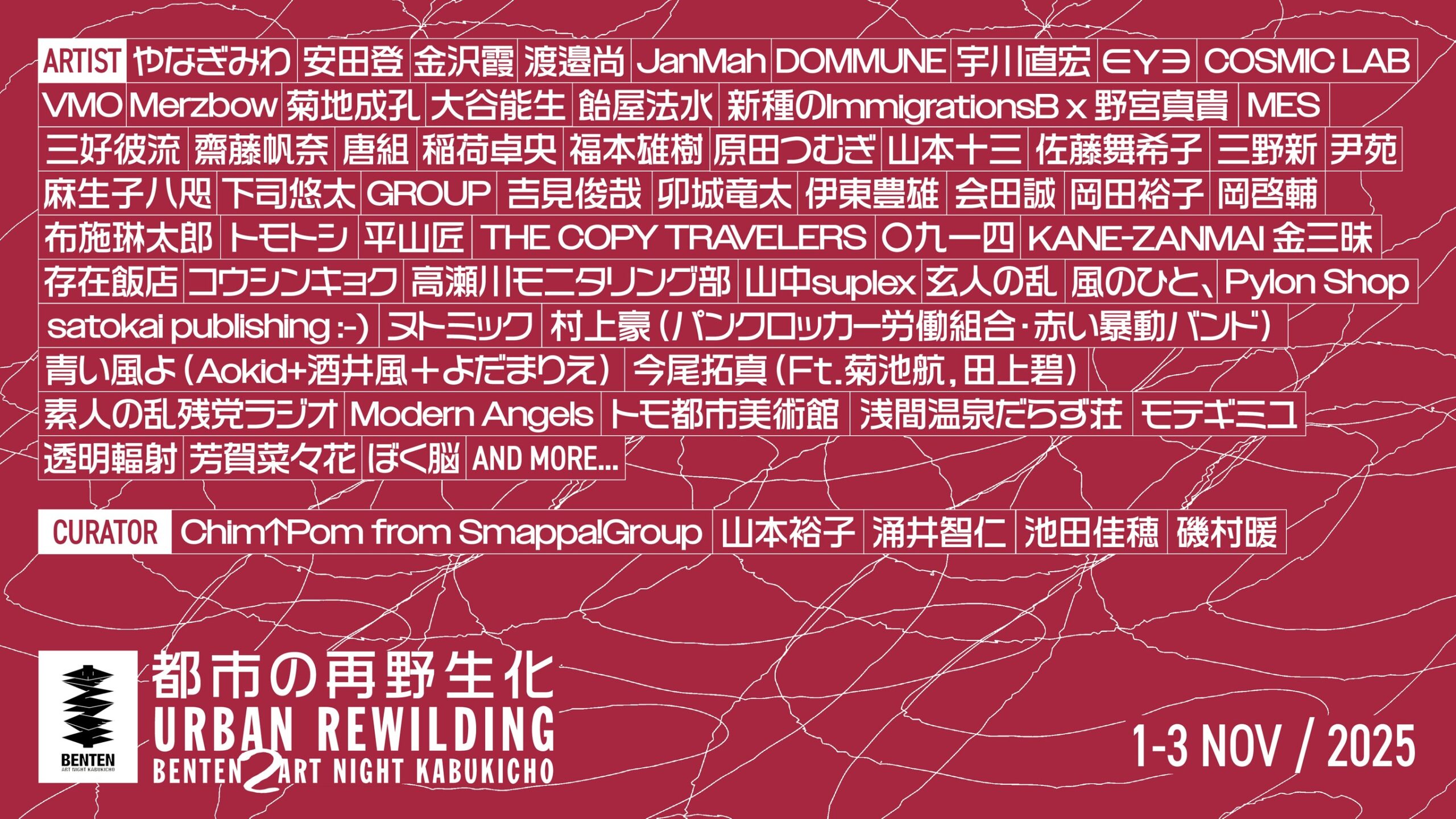 やなぎみわ/安田登/金沢霞/渡邉尚/JanMah/DOMMUNE/宇川直宏/∈Y∋/COSMICLAB/VMO/Merzbow/菊地成孔/大谷能生/飴屋法水/新種のImmigrationsB x 野宮真貴/MES/三好彼流/齋藤帆奈/唐組/稲荷卓央/福本雄樹/原田つむぎ/山本十三/佐藤舞希子/三野新/尹苑/麻生子八咫/下司悠太/GROUP/吉見俊哉/卯城竜太/伊東豊雄/会田誠/岡田裕子/岡啓輔/布施琳太郎/トモトシ/平山匠/THE COPY TRAVELERS/〇九一四/KANE-ZANMAI 金三昧/存在飯店/コウシンキョク/高瀬川モニタリング部/山中suplex/玄人の乱/風のひと、/Pylon Shop/satokai publishing:-)/ヌトミック/村上豪(パンクロッカー労働組合・赤い暴動バンド)/青い風よ(Aokid+酒井風+よだまりえ)/今尾拓真(Ft. 菊池航, 田上碧)/M集会/素人の乱残党ラジオ/Modern Angels/トモ都市美術館/浅間温泉だらず荘/モテギミユ/透明輻射/芳賀菜々花/ぼく脳 …and more!