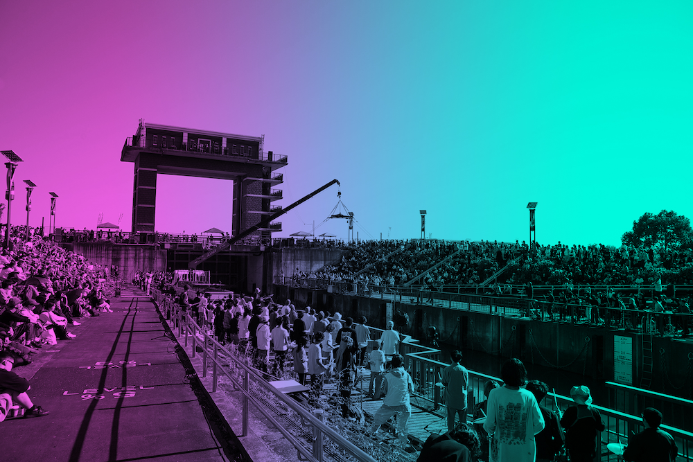 宇川:DOMMUNE KABUKICHOでは夜のトーク&ライブはもちろん、昼間の展示もエクストリームになりそうです。昨年、∈Y∋さんが指揮をとり200人のシンバル隊と演奏する、荒川放水路通水100周年記念のイベント『Arv100』がありました。荒川ロックゲートを囲んで、クレーンで吊るされた∈Y∋さんがコンダクトし音の波を200人で作り上げるという(笑)。昨年の『BENTEN』の真裏で僕らがライブストリーミングしていたそのパフォーマンスの記録を、今年は7面マルチスクリーンで歌舞伎町に持ってきます。