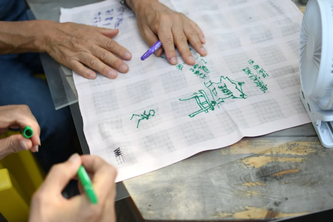 西山:たとえば前島悠太さんというアーティストが実施している「対話について」というプロジェクトが印象深いです。展示物としては文字の書かれているハンカチをつなぎ合わせた旗になります。前島さんは千葉市民たちと何度も少人数で対話の時間を持ってきました。そこでは真ん中にハンカチが置いてあって、初めて会った数人の参加者が、テーマを決めずに何らかの話をします。そのとき話しながら書き留めたメモや落書きが、対話の記録としてハンカチに残されるという仕組みです。
