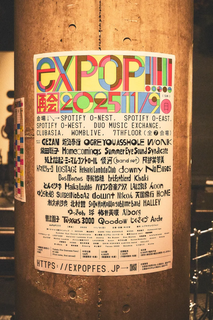 11月9日(日)、NiEWが主催する音楽イベント『exPoP!!!!!再会 2025』が開催された。『exPoP!!!!!』は2007年に始まった無料音楽イベントで、基本的には月に1回、渋谷のライブハウスSpotify O-nest で開催されている。18年目となる今年、その特別編として渋谷の全7会場を舞台としたサーキット型の大規模有料イベントとして開催されたのが、今回の『exPoP!!!!!再会 2025』である。