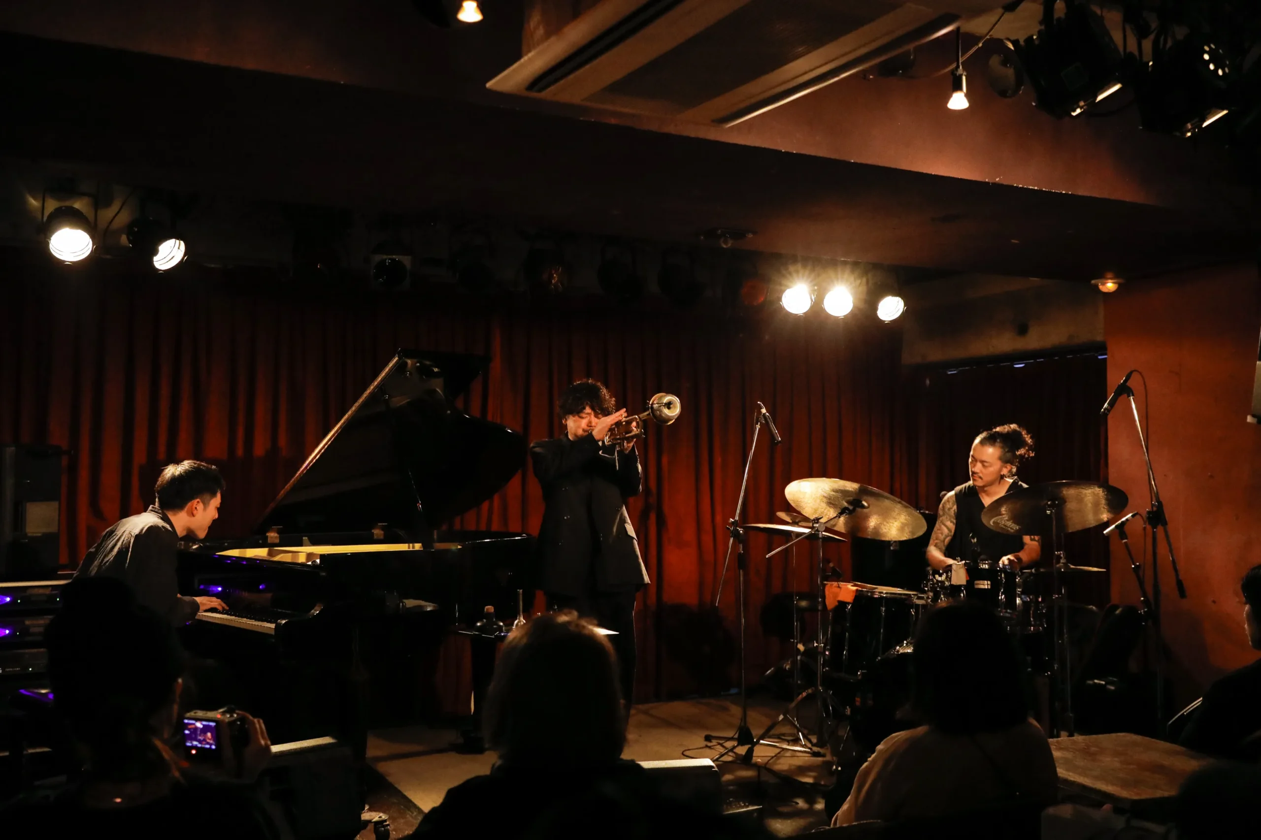 3人の演奏が映し出す光景は、ときに激しい荒波のようであり、ときに切ない夕景のようでもあった。演奏している3人の間にはどんな景色が見えているのだろうか。目を凝らすようにして他の2人のプレイを見つめたり、まったくもって自分の内側を見つめているようだったりする3人の演奏する姿を観ながら、そんなことを感じる。