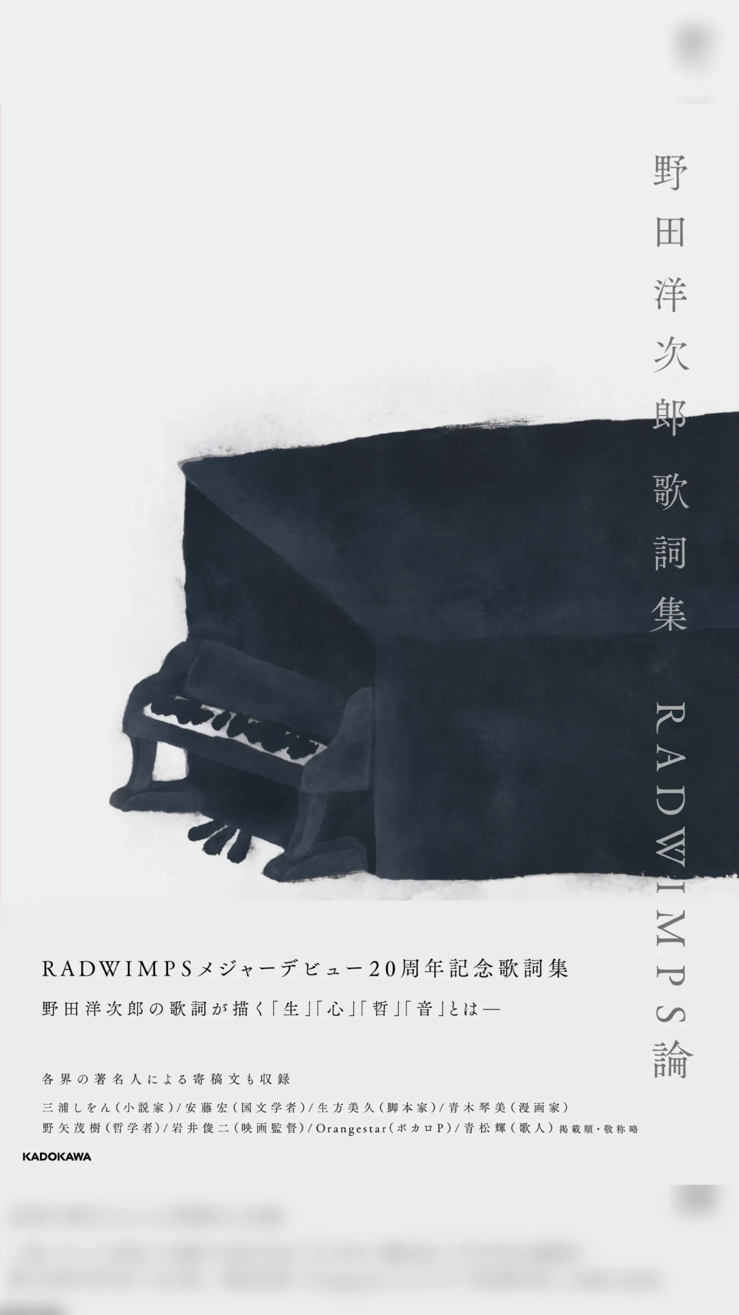 2025年12月19日(金)発売。RADWIMPSメジャーデビュー20周年記念歌詞集。野田洋次郎の歌詞が描く「生」「心」「哲」「音」とは。各界の著名人8名による寄稿文も収録。人生・心情・哲学・音楽をテーマにした、バイブルとしての80曲の歌詞を読むことで、「私にとってのRADWIMPS」が開花する一冊。